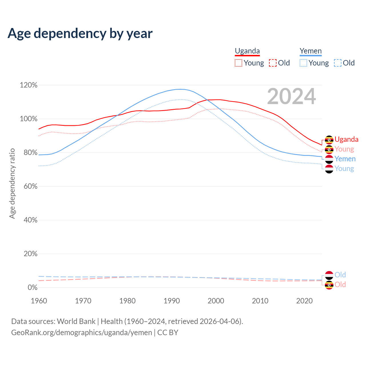 - The share of old-age demographic (65+) in Uganda is 2.19% vs 2.52% in Yemen.