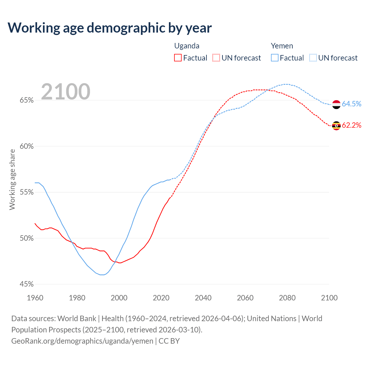 The share of older people aged 65 and over is 2.19% in Uganda and 2.52% in Yemen. Life expectancy in Uganda compared to Yemen .