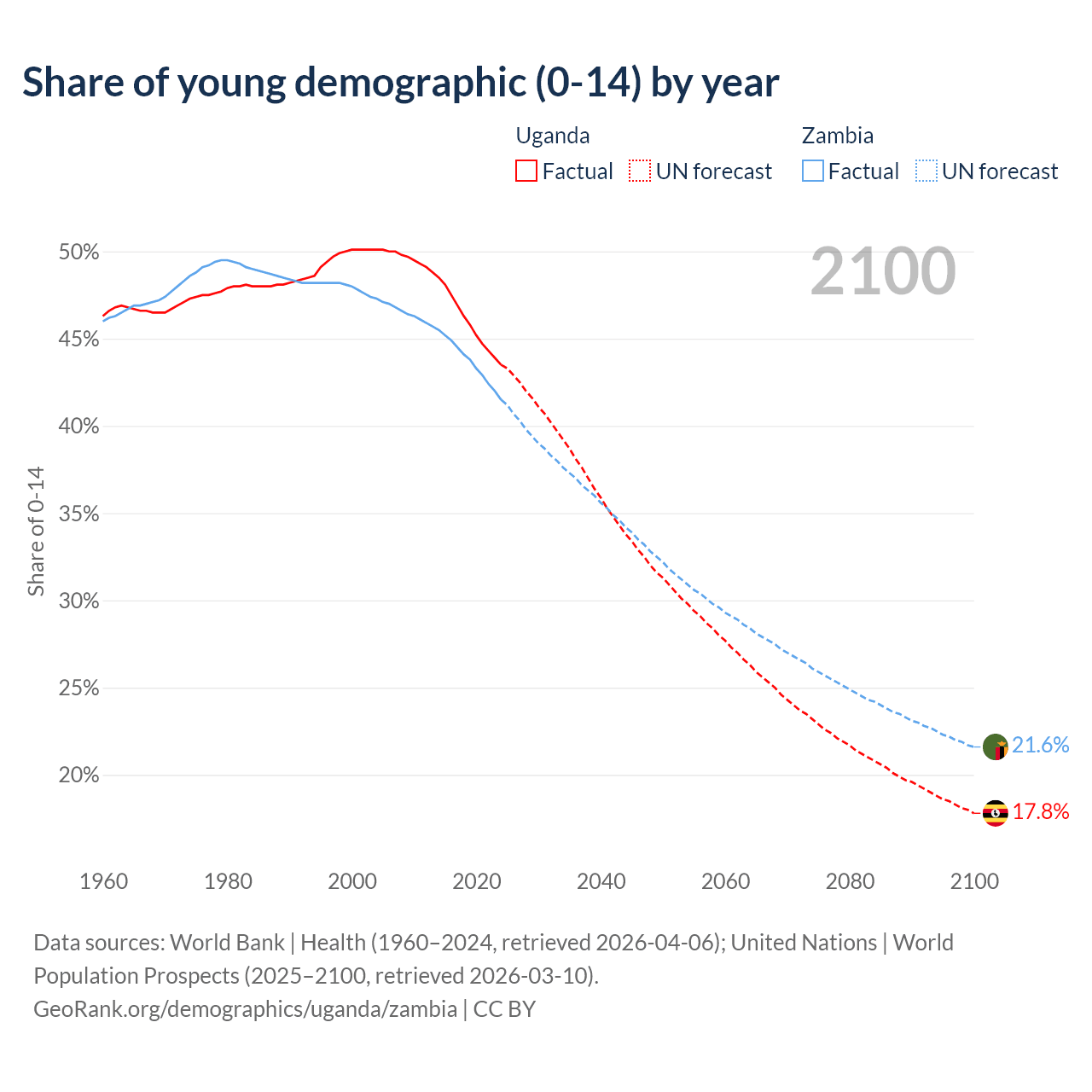 - As of 2026, the population of Uganda is 53.2M vs 22.7M in Zambia - 2.34 times difference.