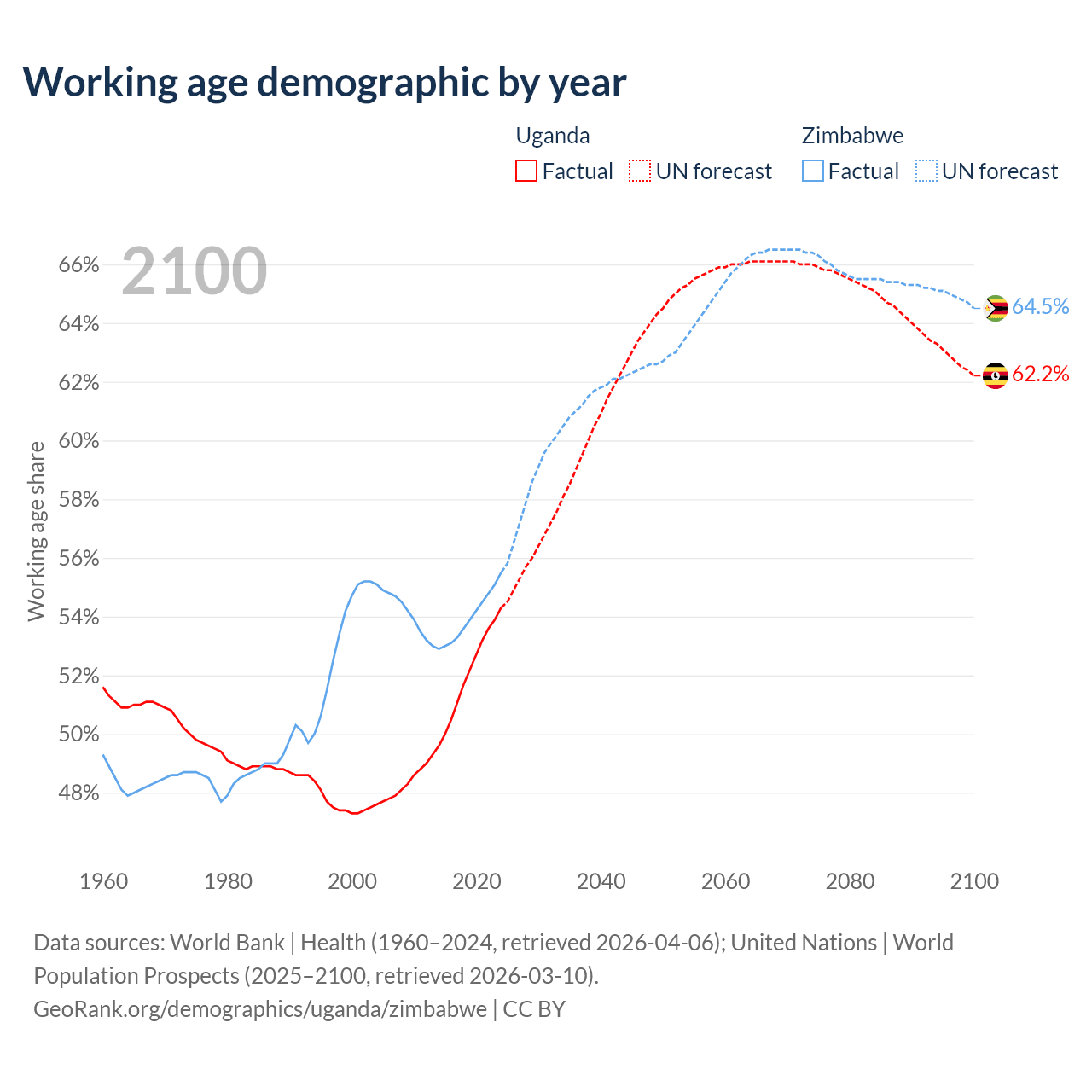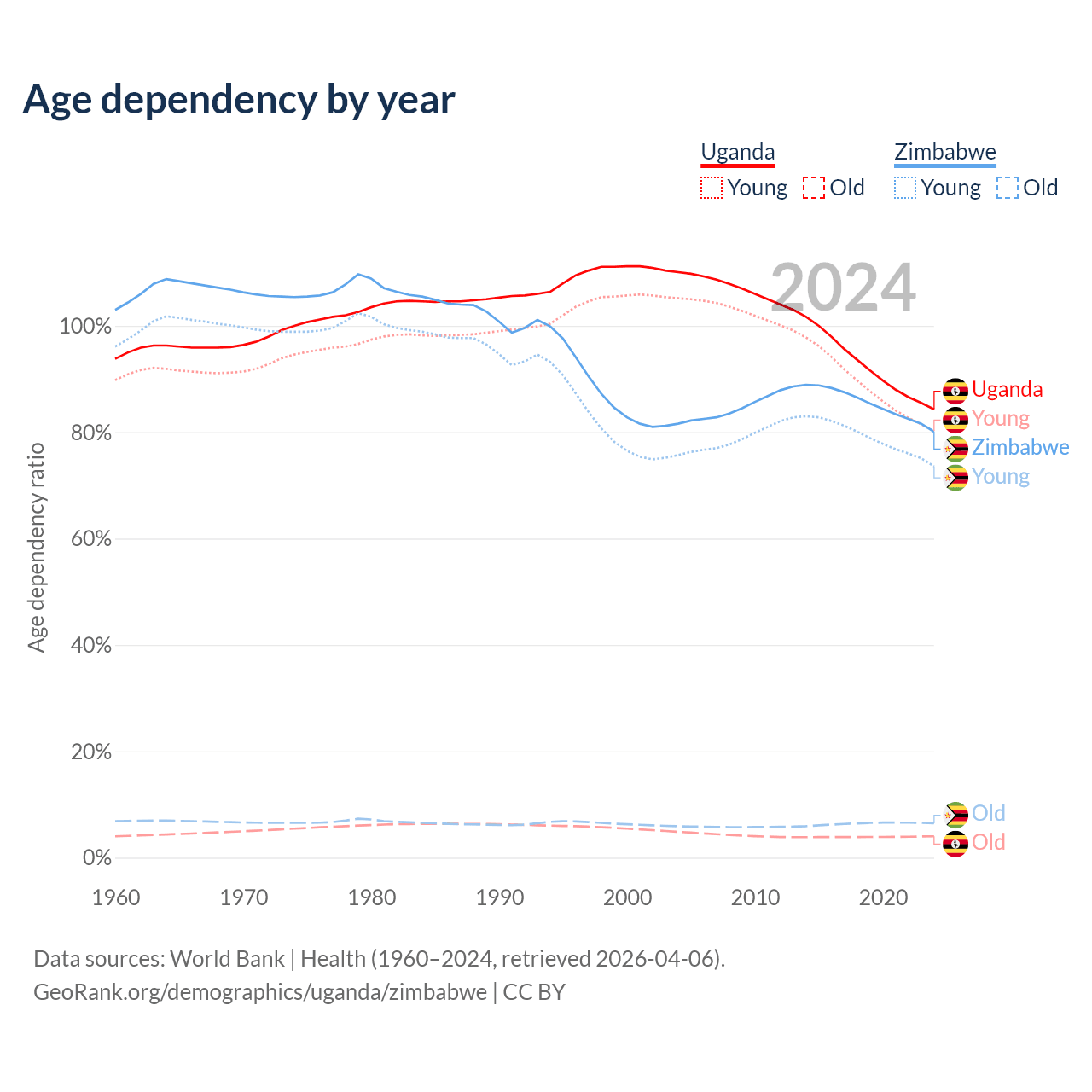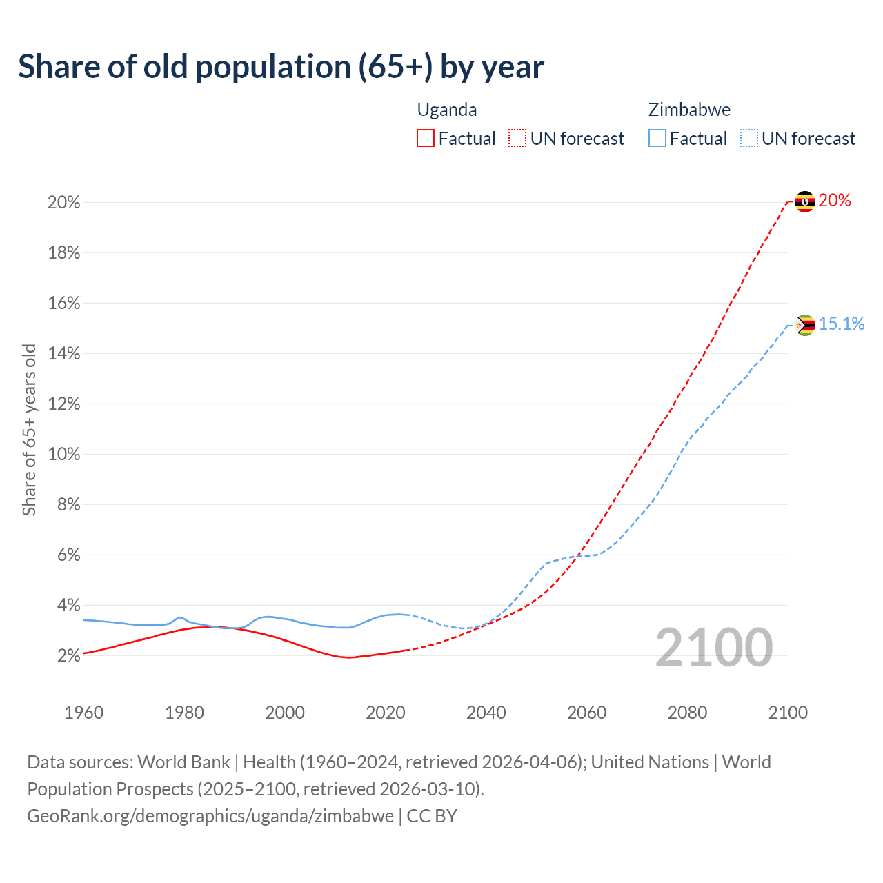 The share of older people aged 65 and over is 2.19% in Uganda and 3.6% in Zimbabwe. Life expectancy in Uganda compared to Zimbabwe .
