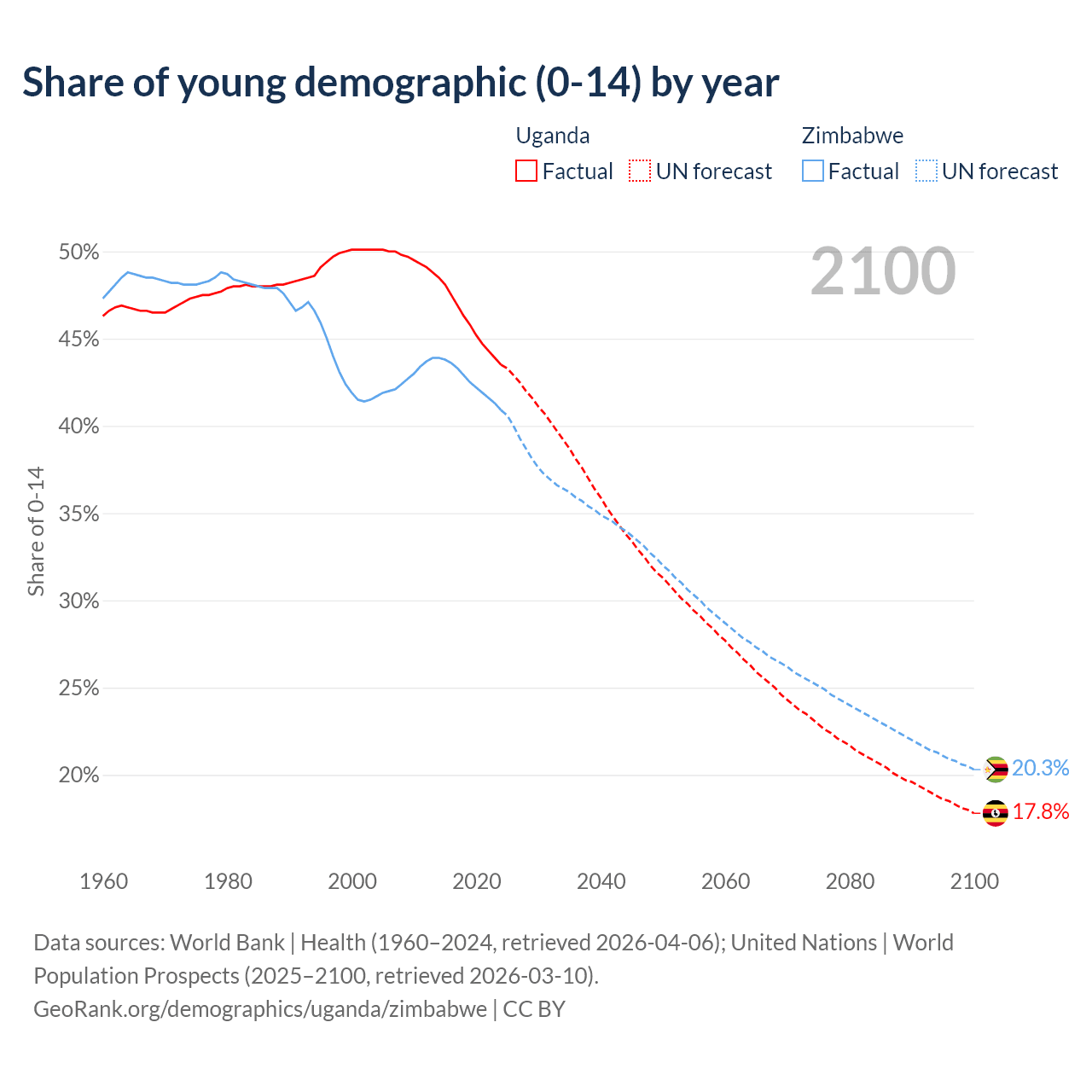 Median age Uganda vs Zimbabwe, 1960-2100