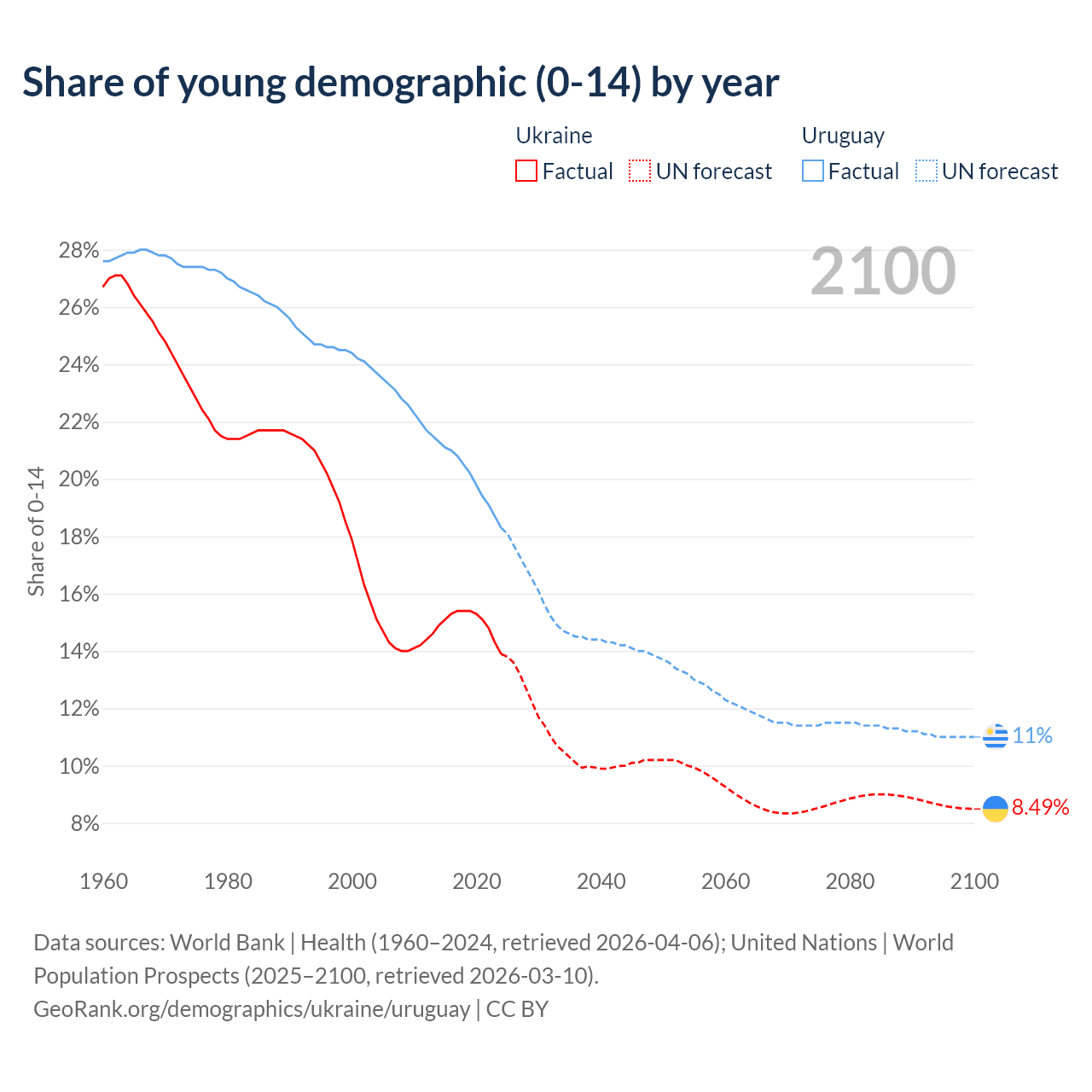 - The share of young demographic (0-15 years old) in Ukraine is 13.9% vs 18.3% in Uruguay.