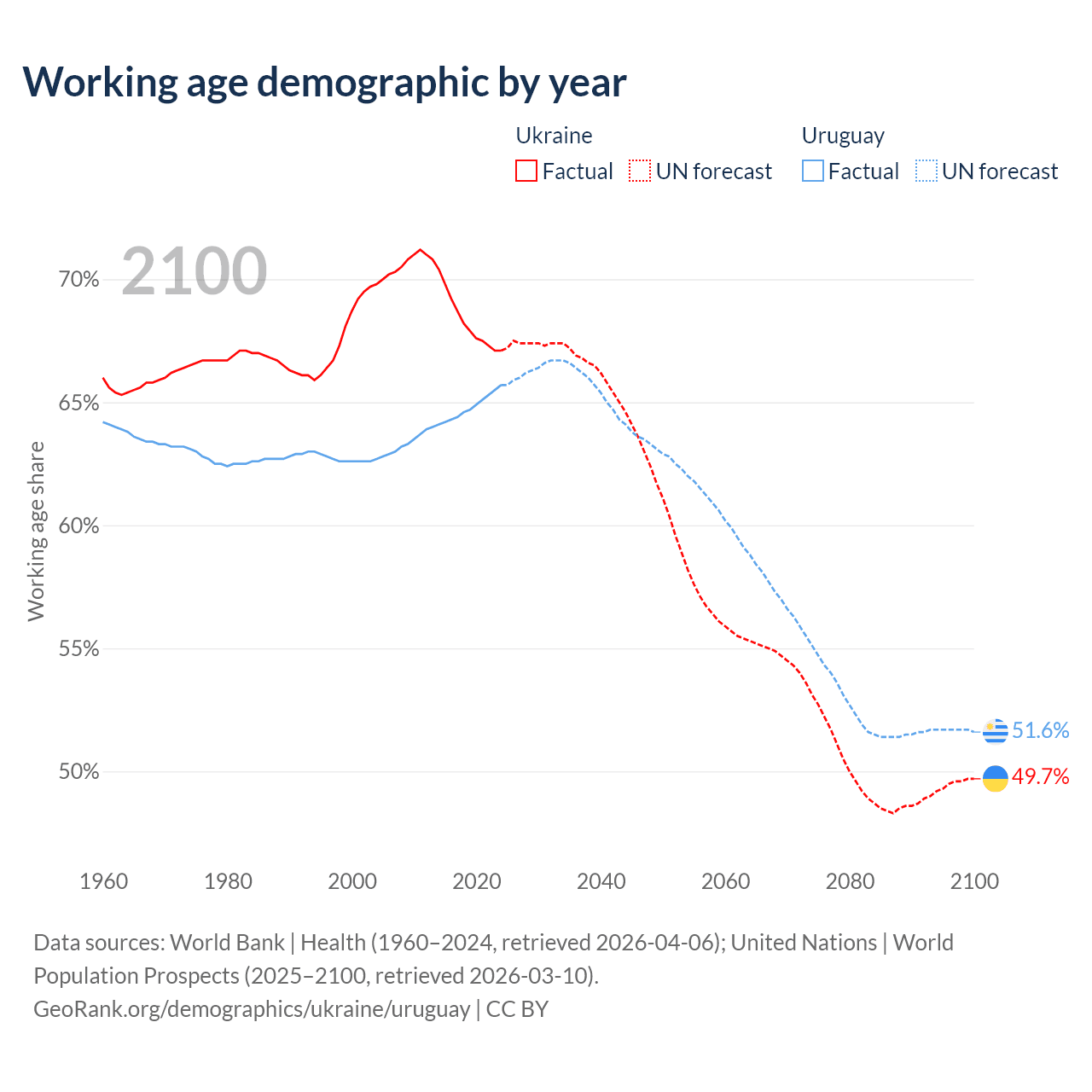 - Ukraine has 26.9M working age adults (aged 15-64) vs 2.22M in Uruguay.