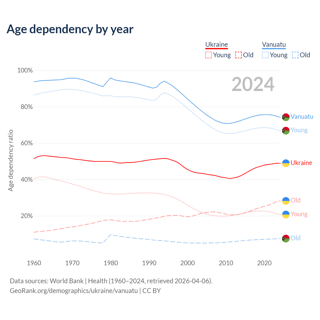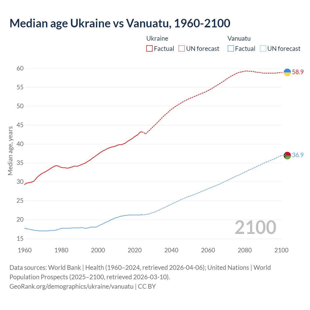 - Ukraine is ranked 26/196 by median age (oldest to youngest) vs 156/196 for Vanuatu.