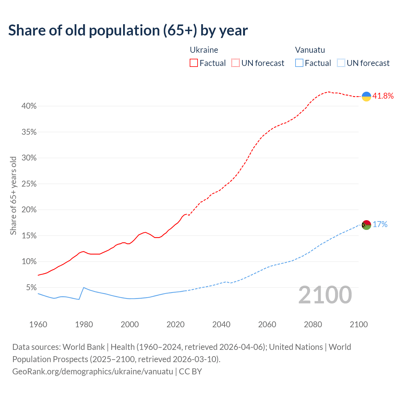 The share of older people aged 65 and over is 19% in Ukraine and 4.3% in Vanuatu. Life expectancy in Ukraine compared to Vanuatu .