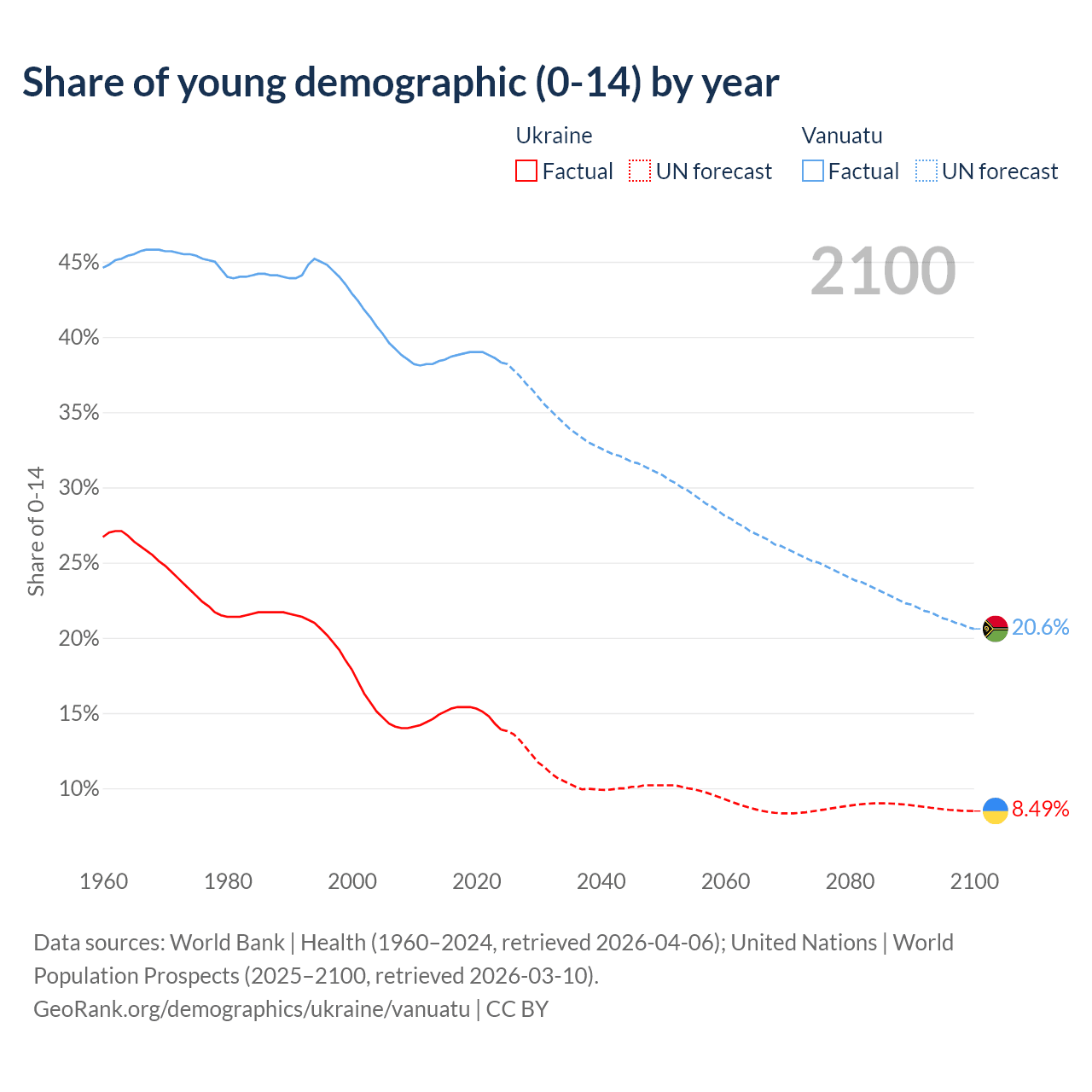 - The share of young demographic (0-15 years old) in Ukraine is 13.9% vs 38.3% in Vanuatu.