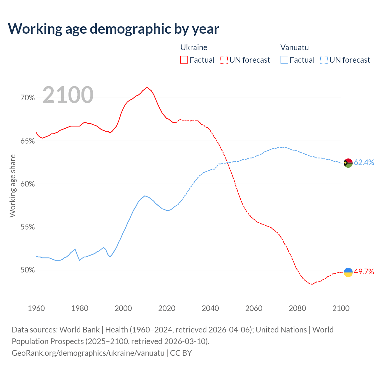 - Ukraine has 26.9M working age adults (aged 15-64) vs 198K in Vanuatu.