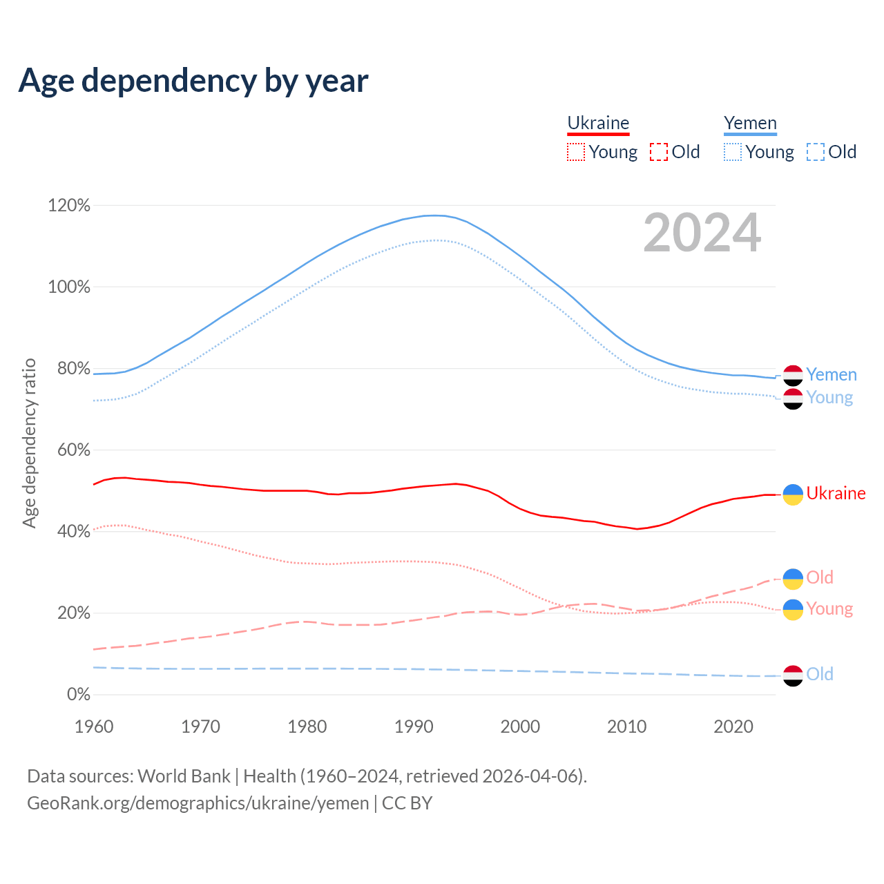- The share of old-age demographic (65+) in Ukraine is 19% vs 2.52% in Yemen.