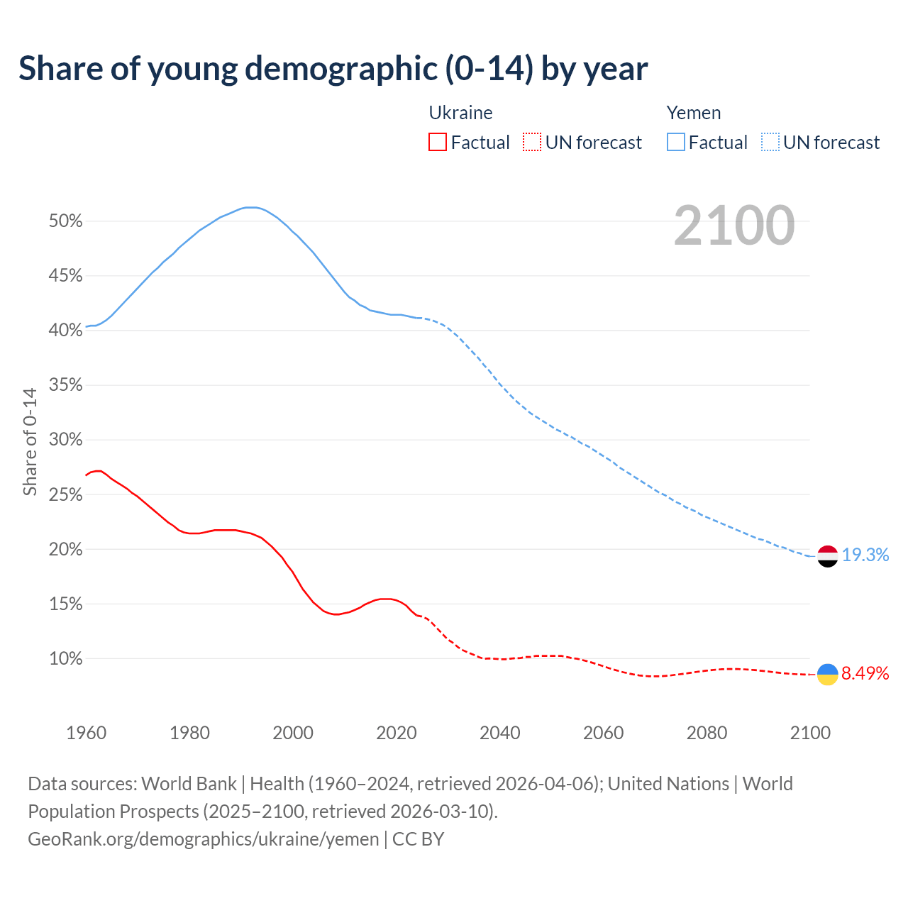 - The share of young demographic (0-15 years old) in Ukraine is 13.9% vs 41.1% in Yemen.