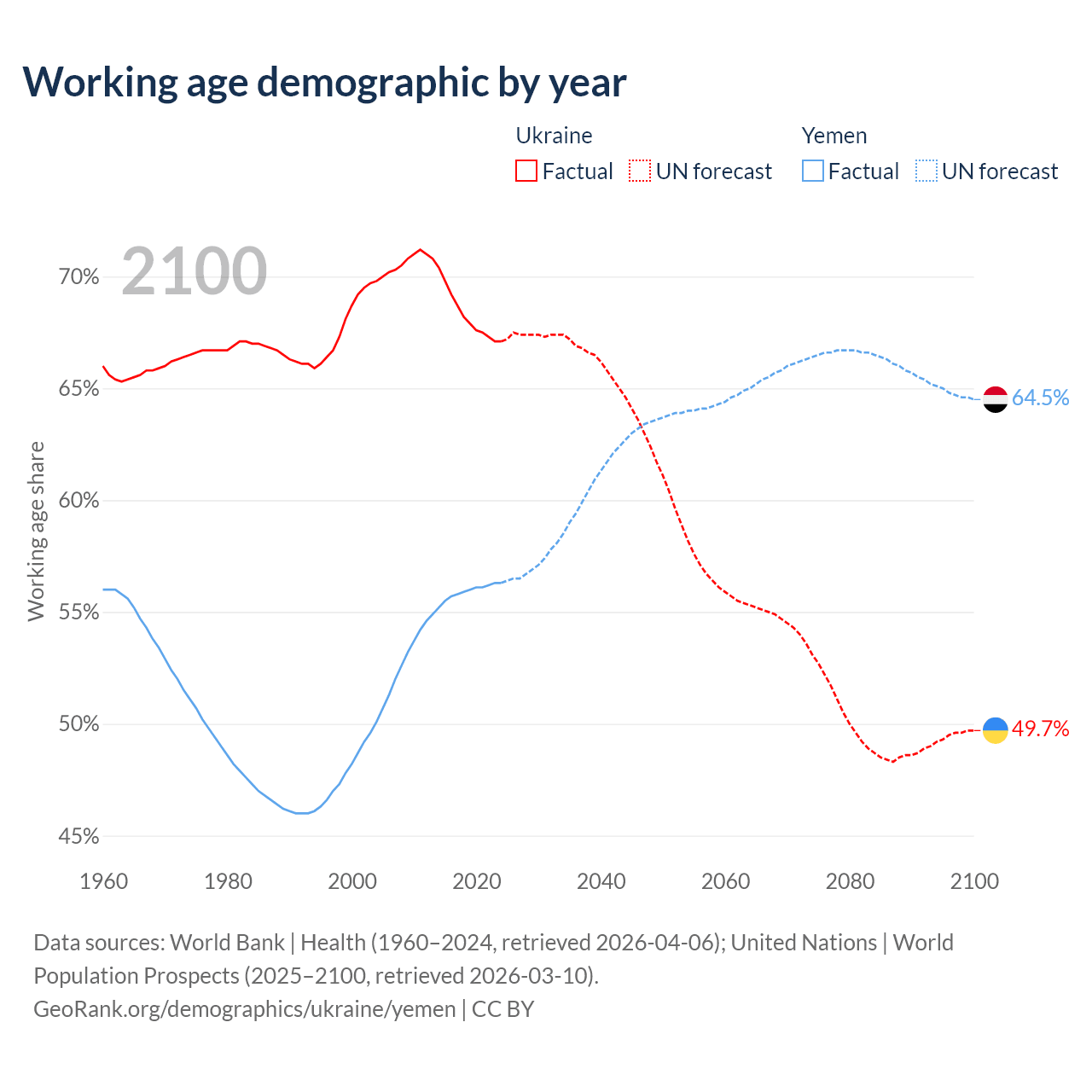 The share of older people aged 65 and over is 19% in Ukraine and 2.52% in Yemen. Life expectancy in Ukraine compared to Yemen .
