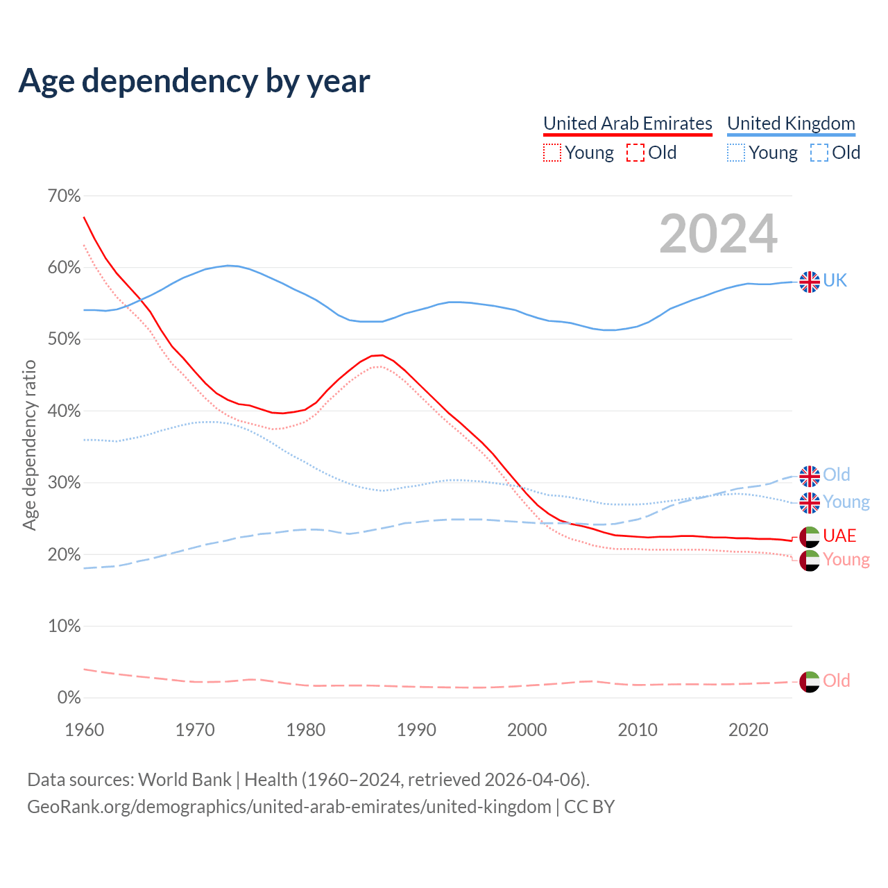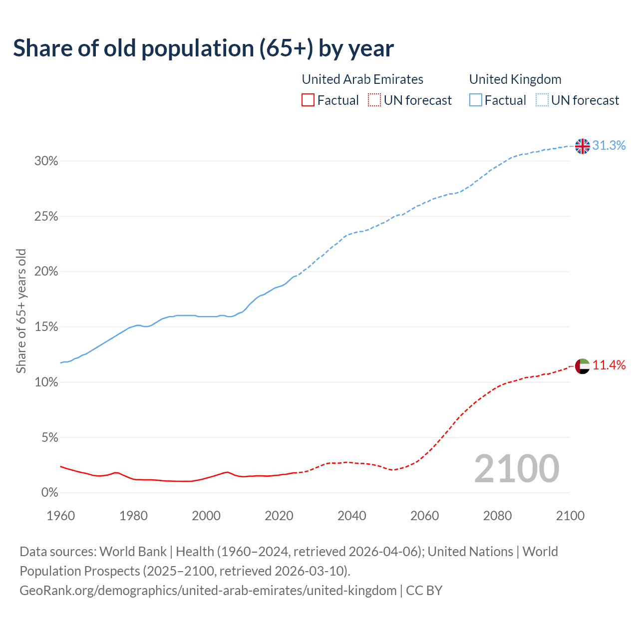 The share of older people aged 65 and over is 1.77% in the United Arab Emirates and 19.5% in the United Kingdom. Life expectancy in the United Arab Emirates compared to the United Kingdom .