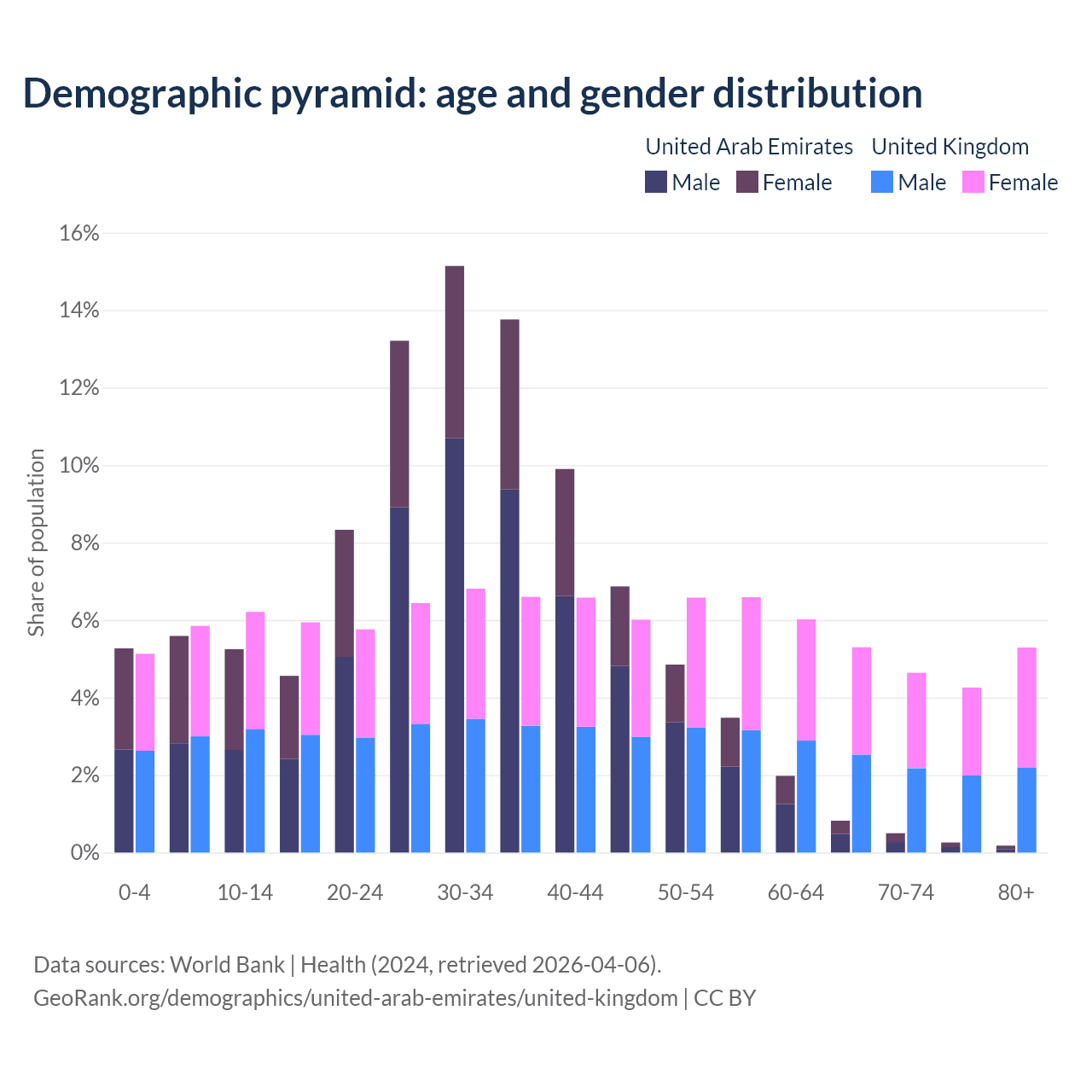 - The United Arab Emirates is ranked 91/196 by median age (oldest to youngest) vs 41/196 for the United Kingdom.