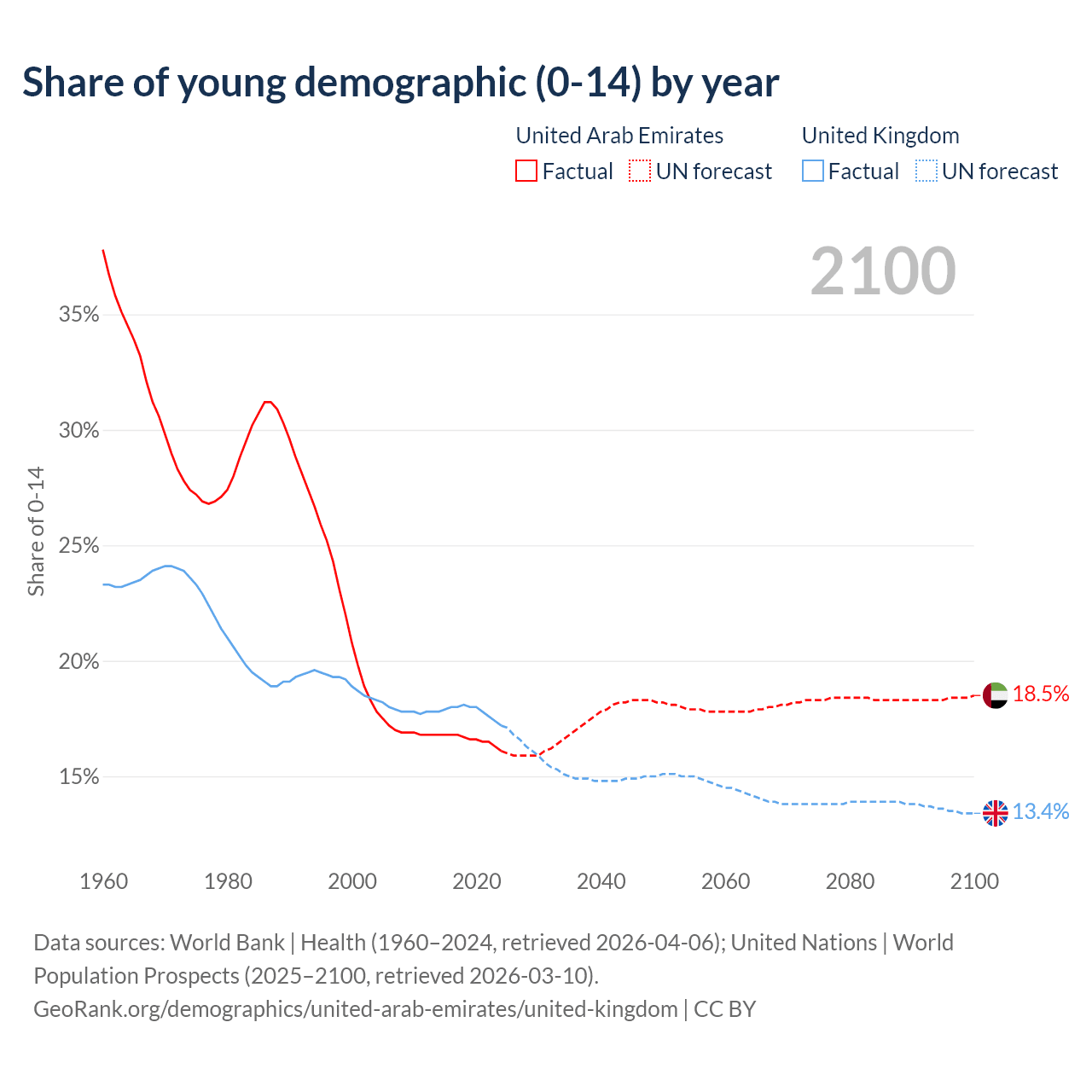 - The share of young demographic (0-15 years old) in the United Arab Emirates is 16.1% vs 17.2% in the United Kingdom.