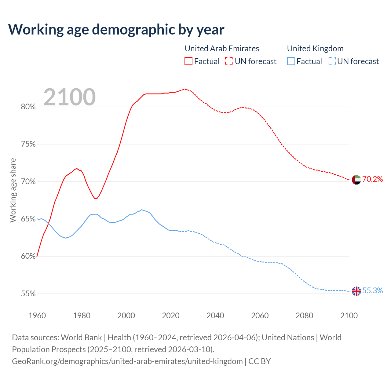 - The United Arab Emirates has 9.6M working age adults (aged 15-64) vs 44.4M in the United Kingdom.