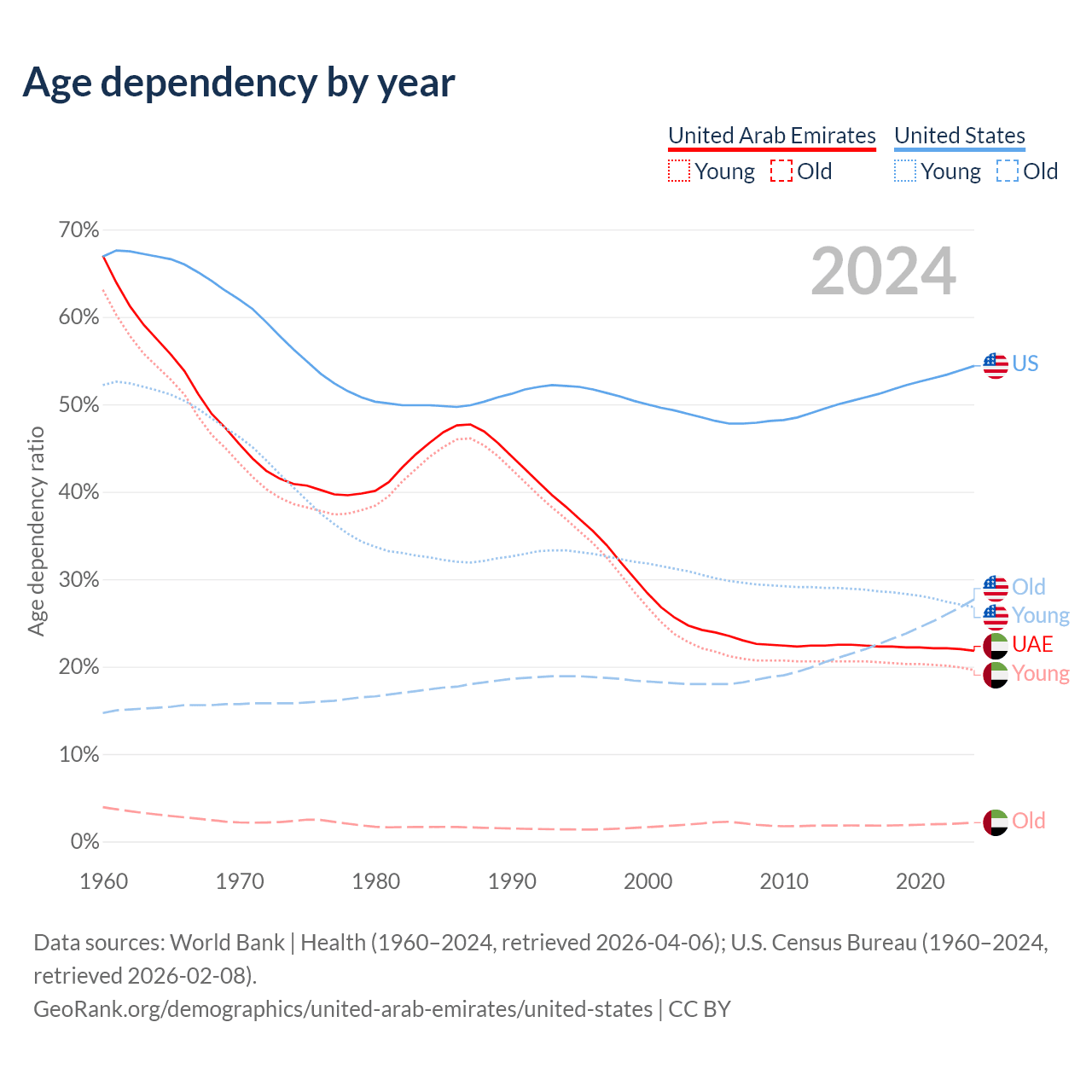 - The share of old-age demographic (65+) in the United Arab Emirates is 1.77% vs 17.9% in the United States.