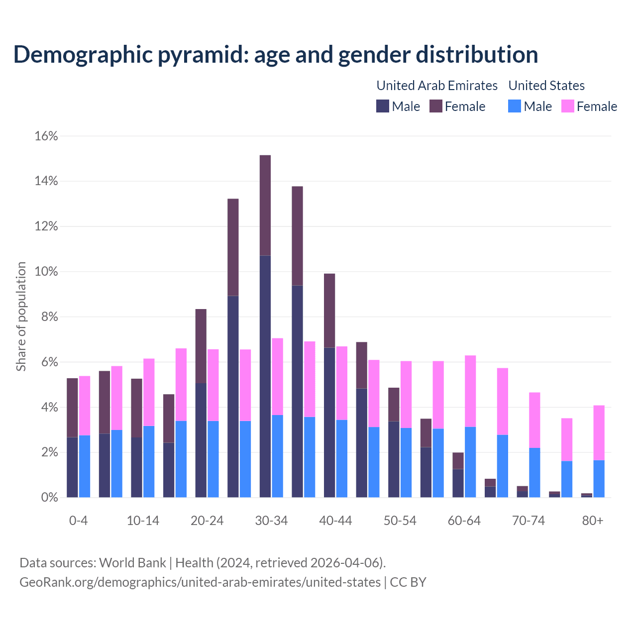 - The United Arab Emirates is ranked 91/196 by median age (oldest to youngest) vs 50/196 for the United States.