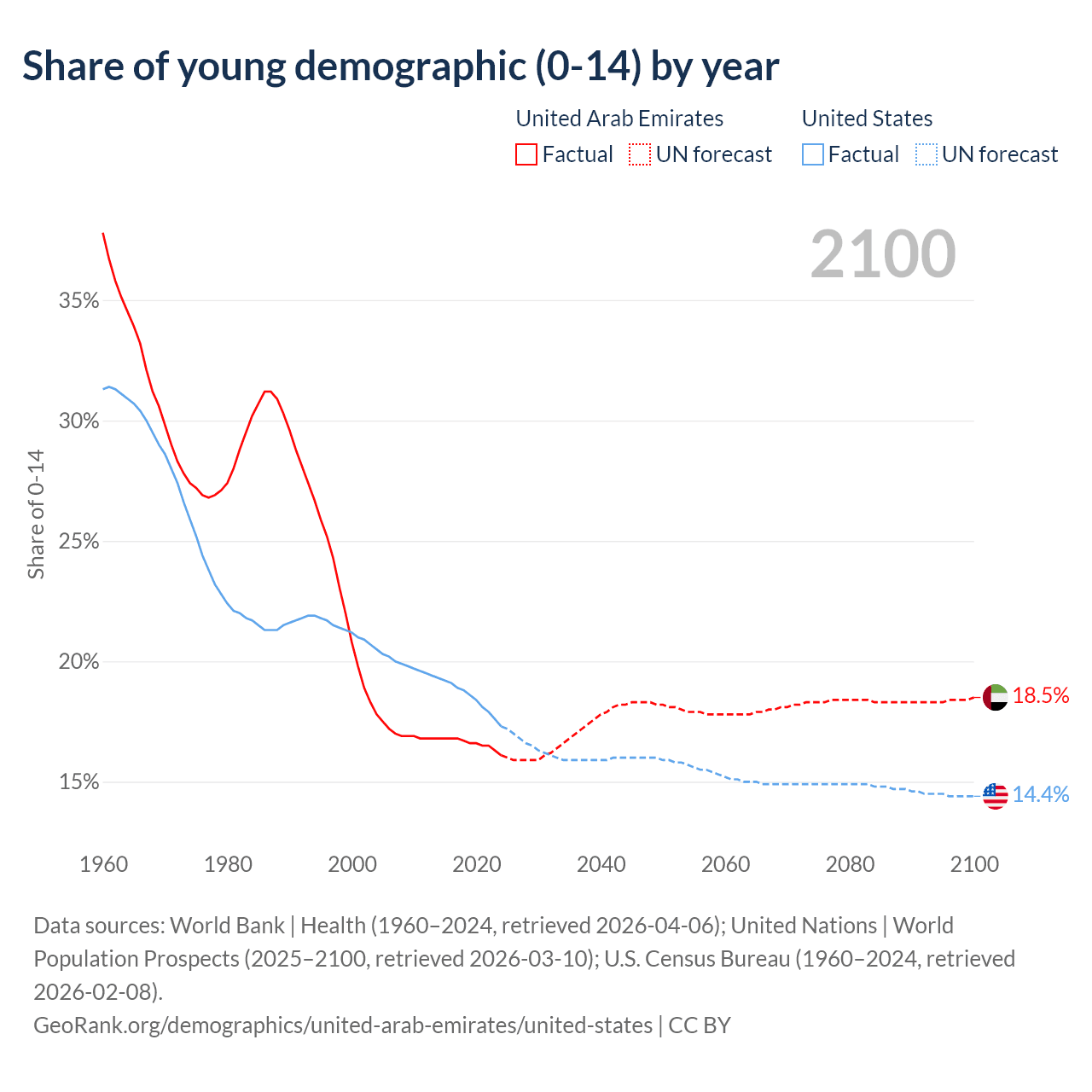 - The share of young demographic (0-15 years old) in the United Arab Emirates is 16.1% vs 17.3% in the United States.