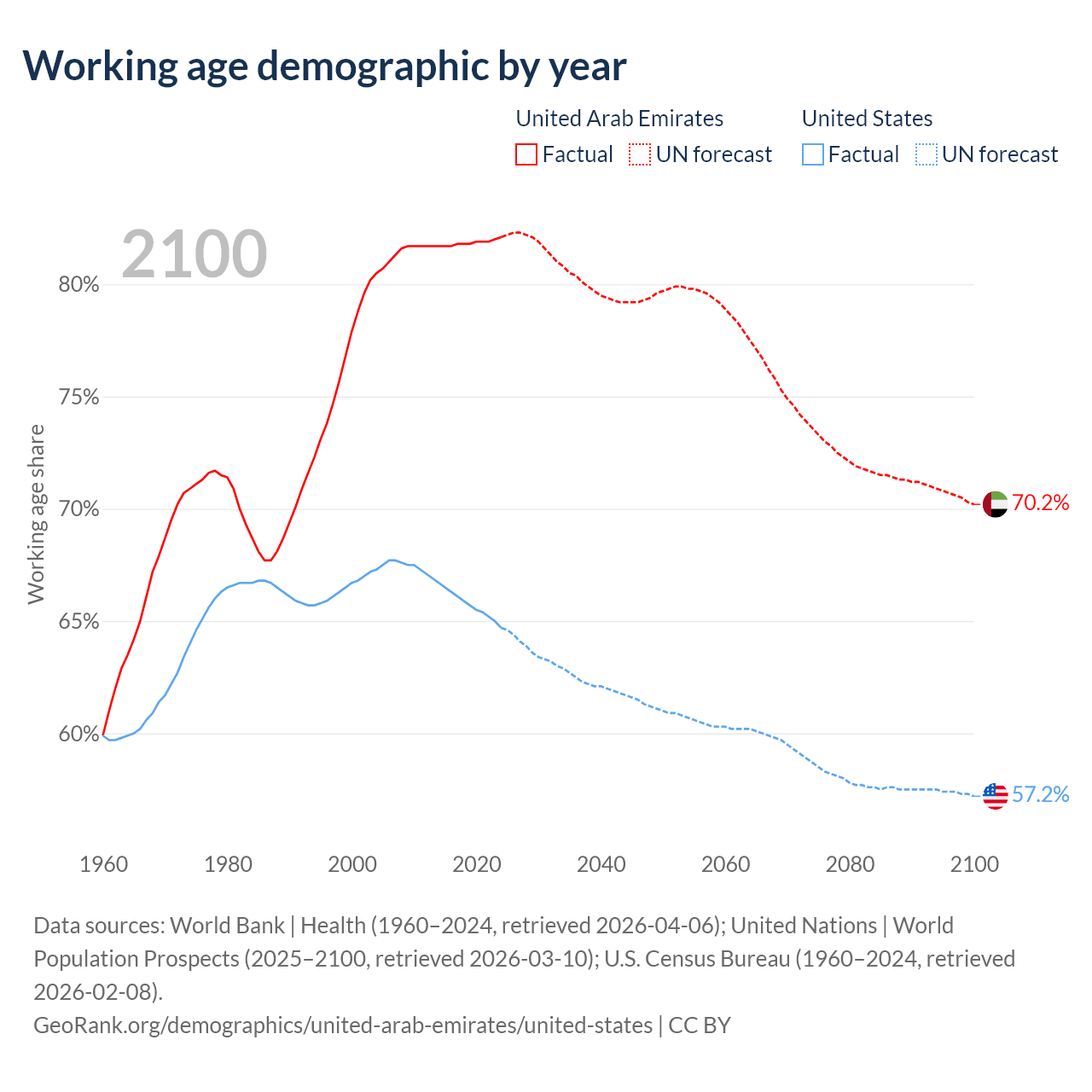 - The United Arab Emirates has 9.6M working age adults (aged 15-64) vs 223M in the United States.