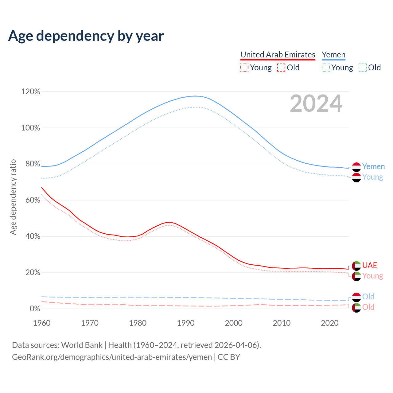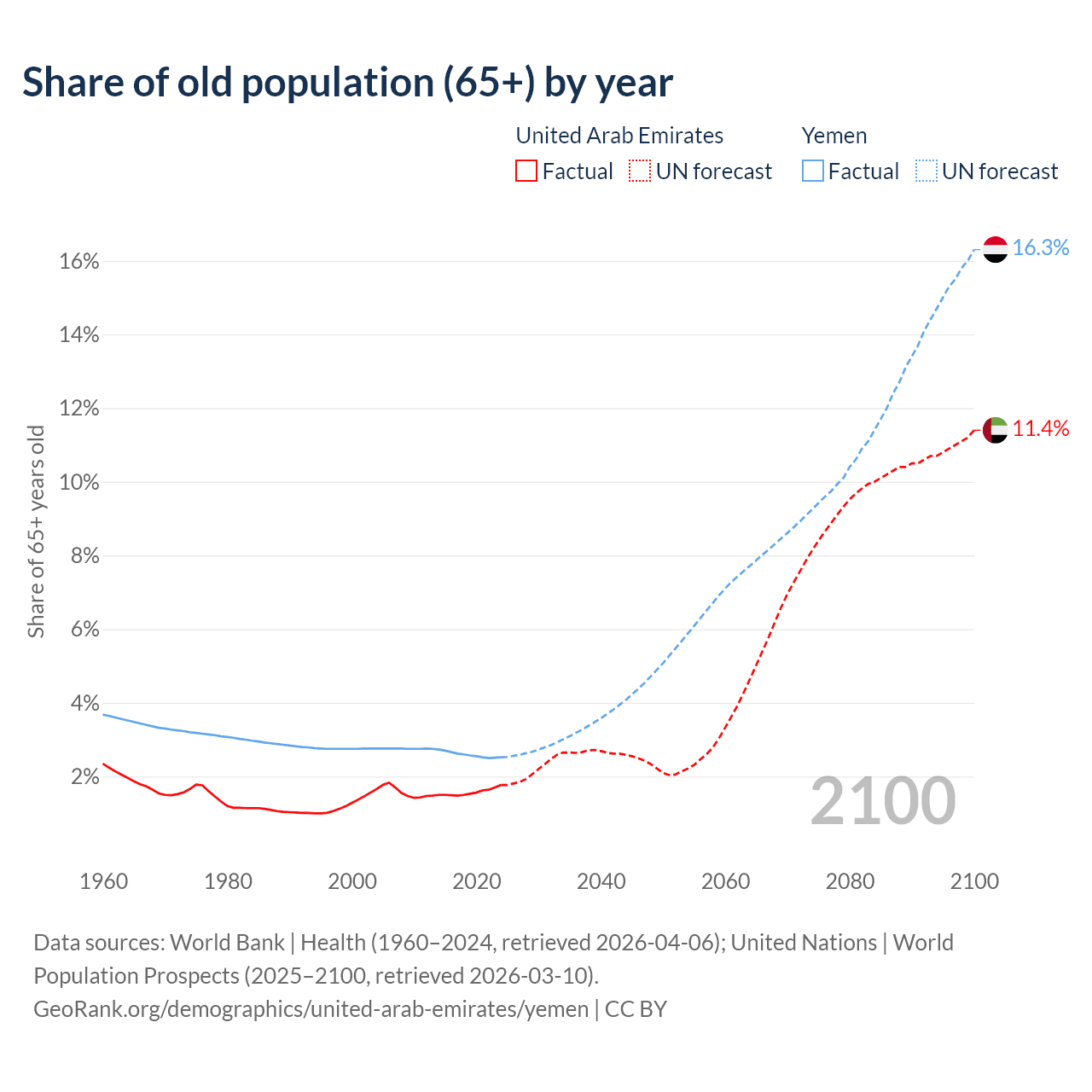 The share of older people aged 65 and over is 1.77% in the United Arab Emirates and 2.52% in Yemen. Life expectancy in the United Arab Emirates compared to Yemen .