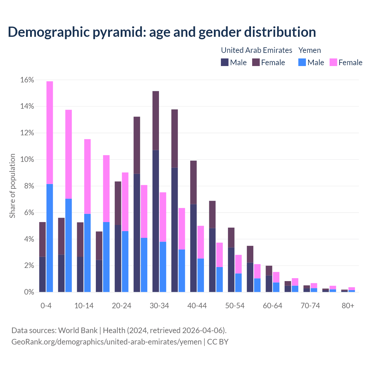 - The United Arab Emirates is ranked 91/196 by median age (oldest to youngest) vs 174/196 for Yemen.