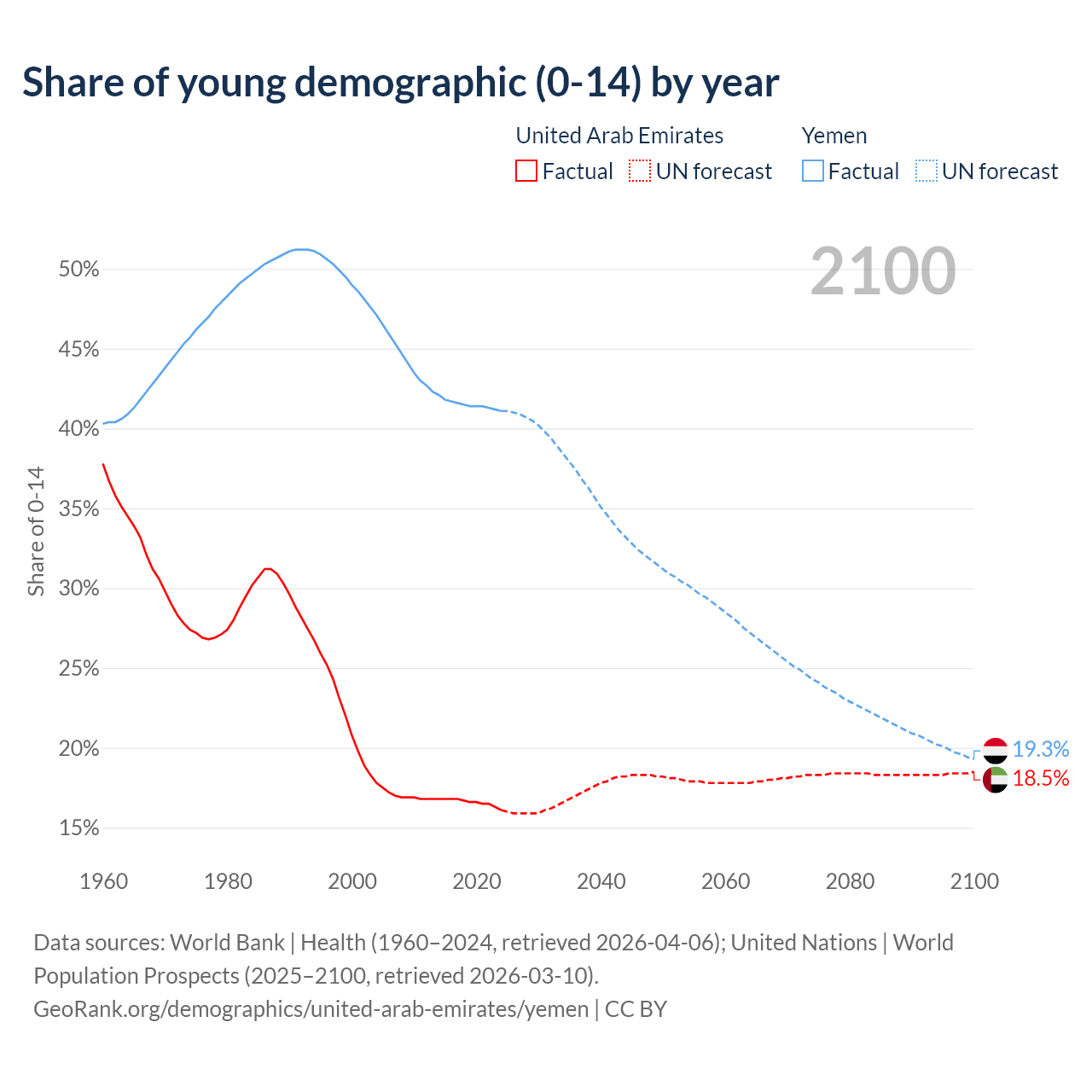 - The share of young demographic (0-15 years old) in the United Arab Emirates is 16.1% vs 41.1% in Yemen.