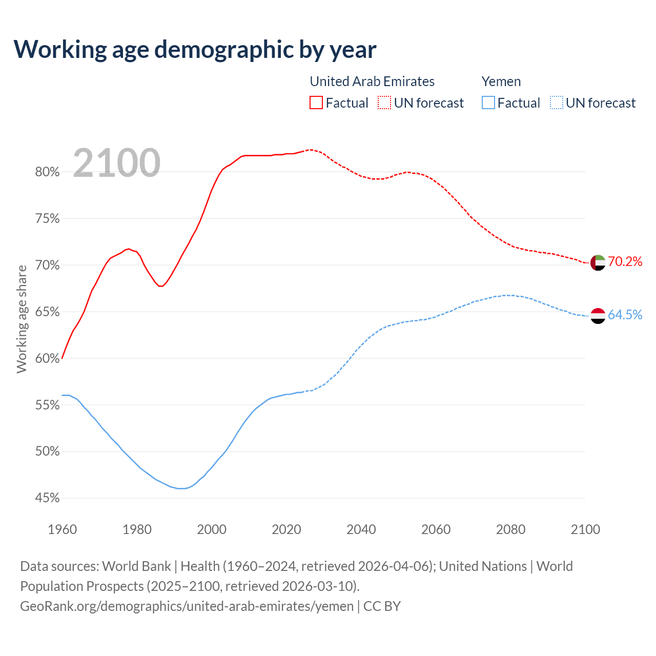 - The United Arab Emirates has 9.6M working age adults (aged 15-64) vs 24.4M in Yemen.