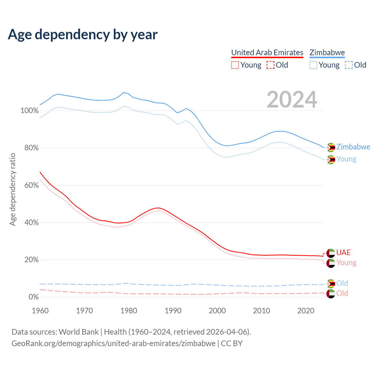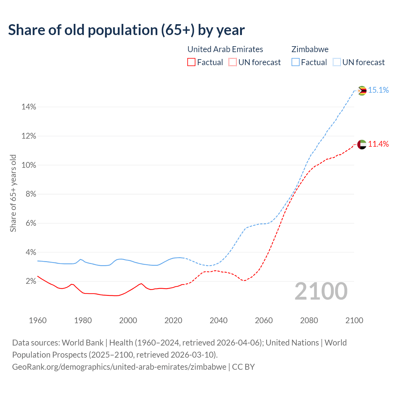 The share of older people aged 65 and over is 1.77% in the United Arab Emirates and 3.6% in Zimbabwe. Life expectancy in the United Arab Emirates compared to Zimbabwe .