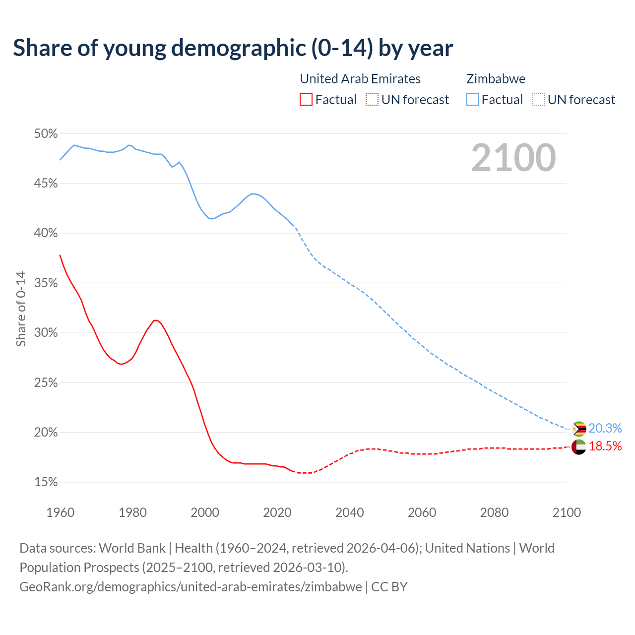 - The share of young demographic (0-15 years old) in the United Arab Emirates is 16.1% vs 40.9% in Zimbabwe.