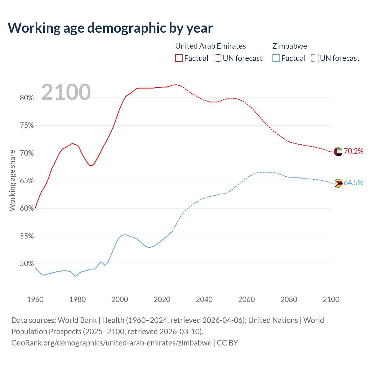 - The United Arab Emirates has 9.6M working age adults (aged 15-64) vs 9.64M in Zimbabwe.