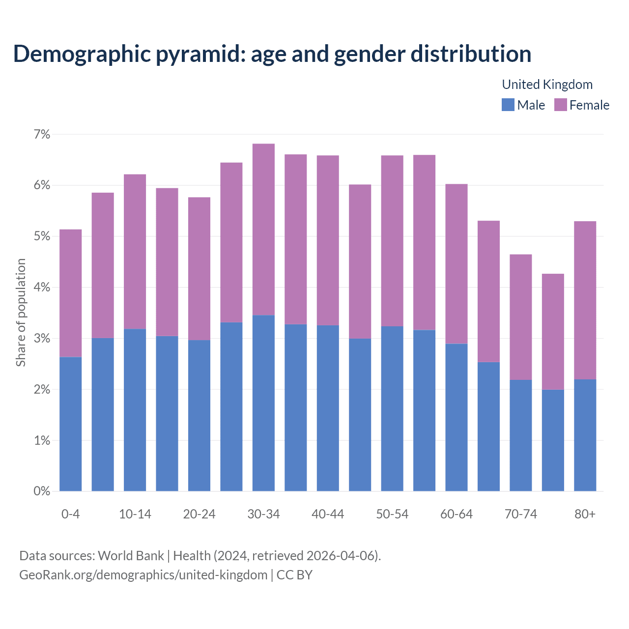 With a population of 69.2M people, the United Kingdom has a median age of 41 years which makes it the 41/196 oldest country. 17.2% of the demographic are children 0-14 years old, 63.3% are working-age people aged 15-64, and 19.5% are older population aged 65+ years.