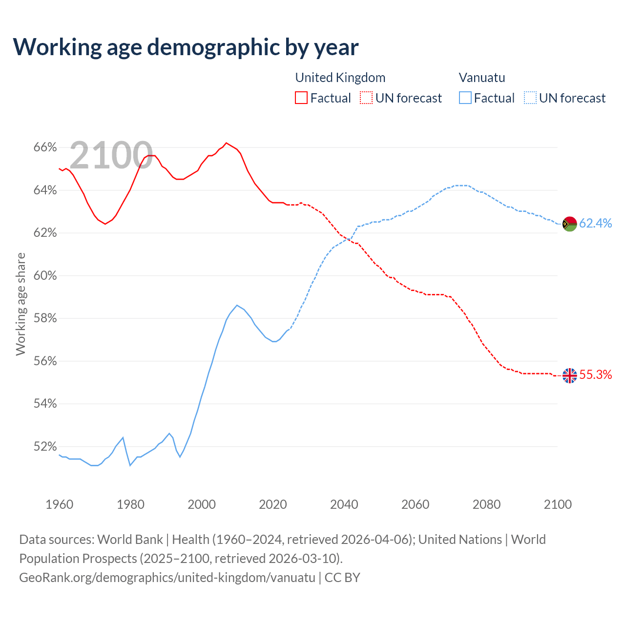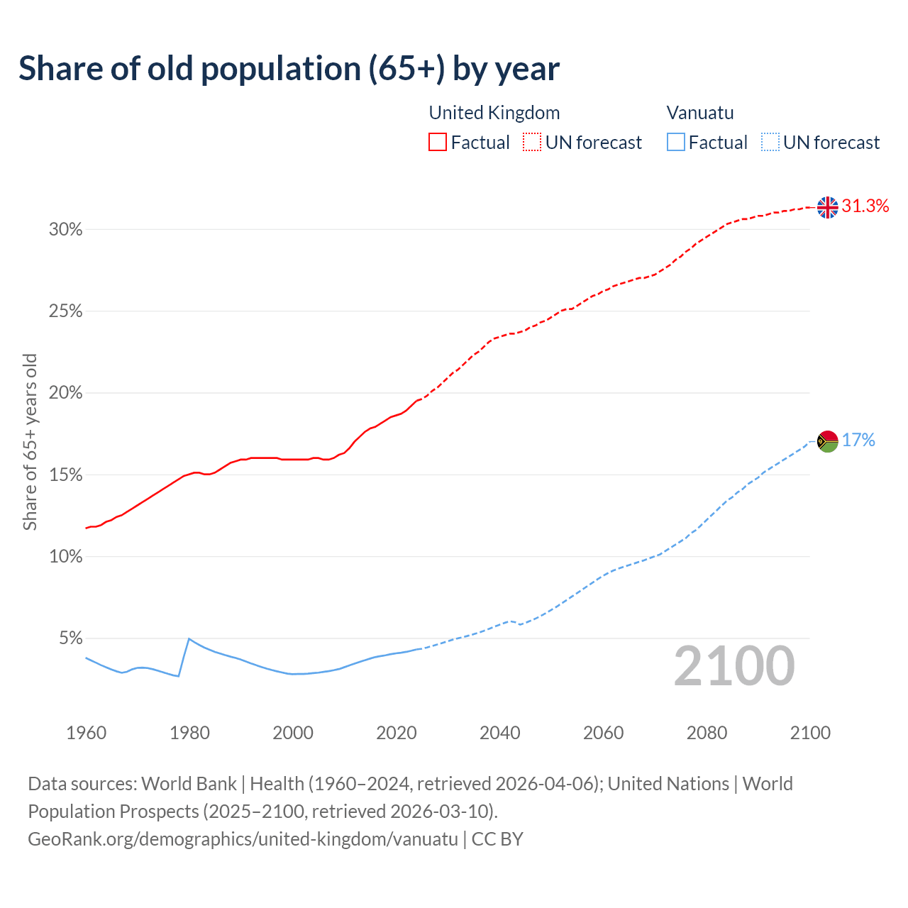 - The share of old-age demographic (65+) in the United Kingdom is 19.5% vs 4.3% in Vanuatu.