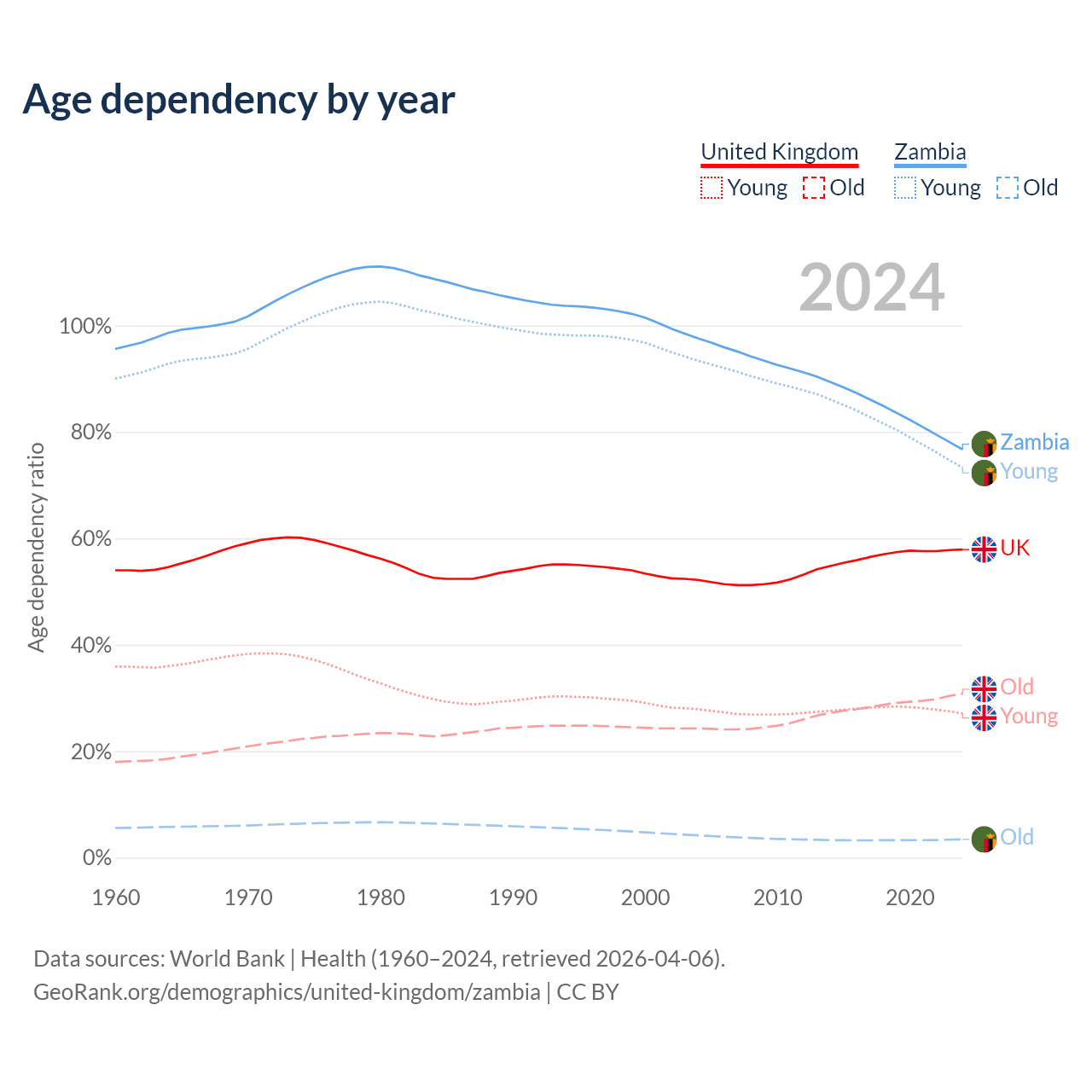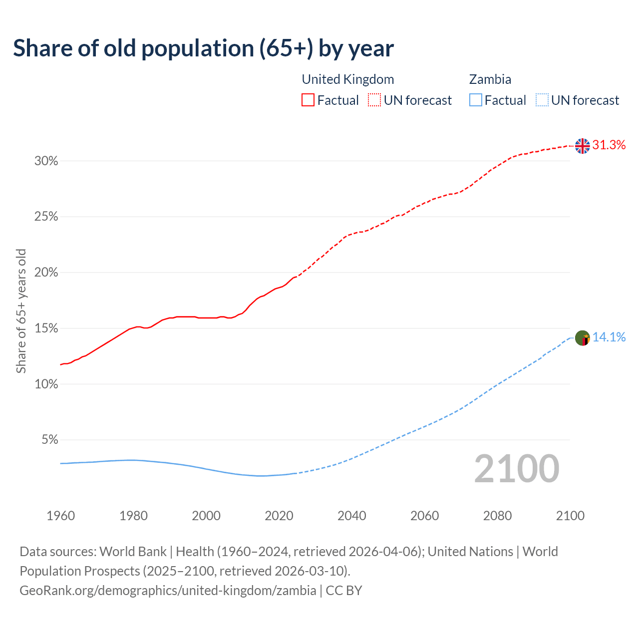 The share of older people aged 65 and over is 19.5% in the United Kingdom and 1.95% in Zambia. Life expectancy in the United Kingdom compared to Zambia .