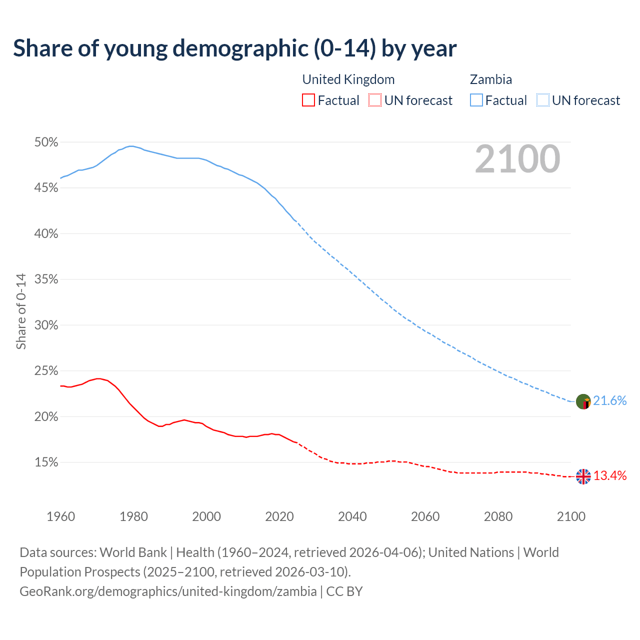 - The share of young demographic (0-15 years old) in the United Kingdom is 17.2% vs 41.5% in Zambia.