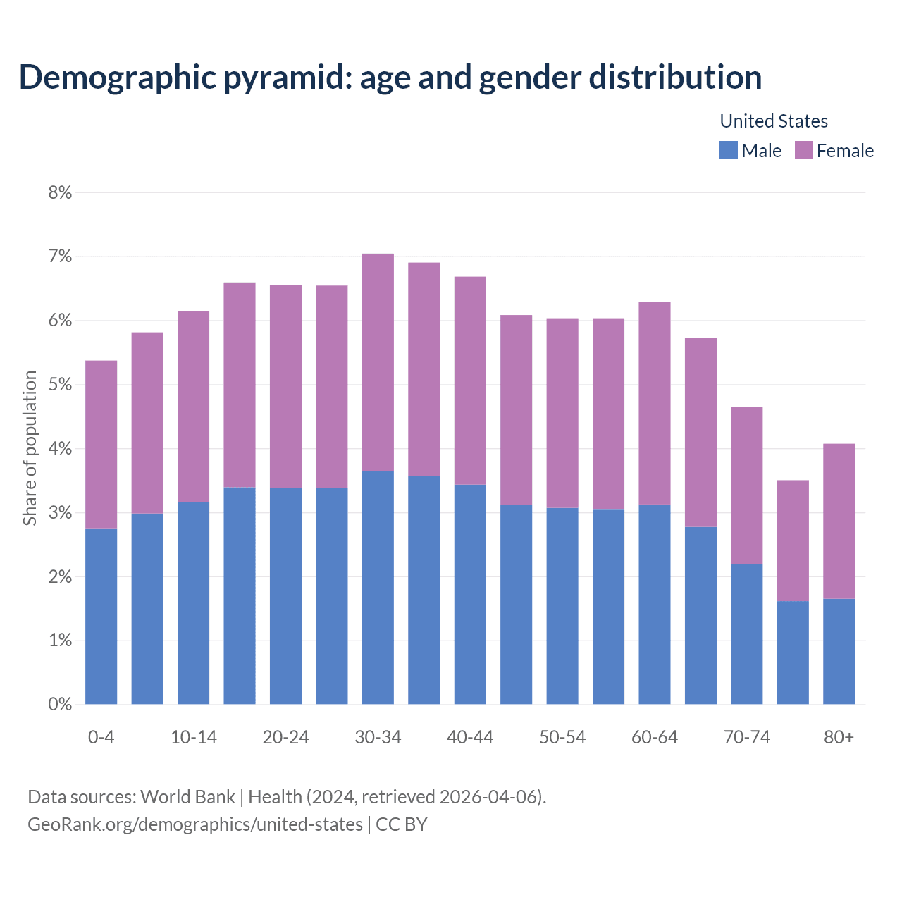 With a population of 342M people, the United States has a median age of 39.3 years which makes it the 50/196 oldest country. 17.3% of the demographic are children 0-14 years old, 64.7% are working-age people aged 15-64, and 17.9% are older population aged 65+ years.