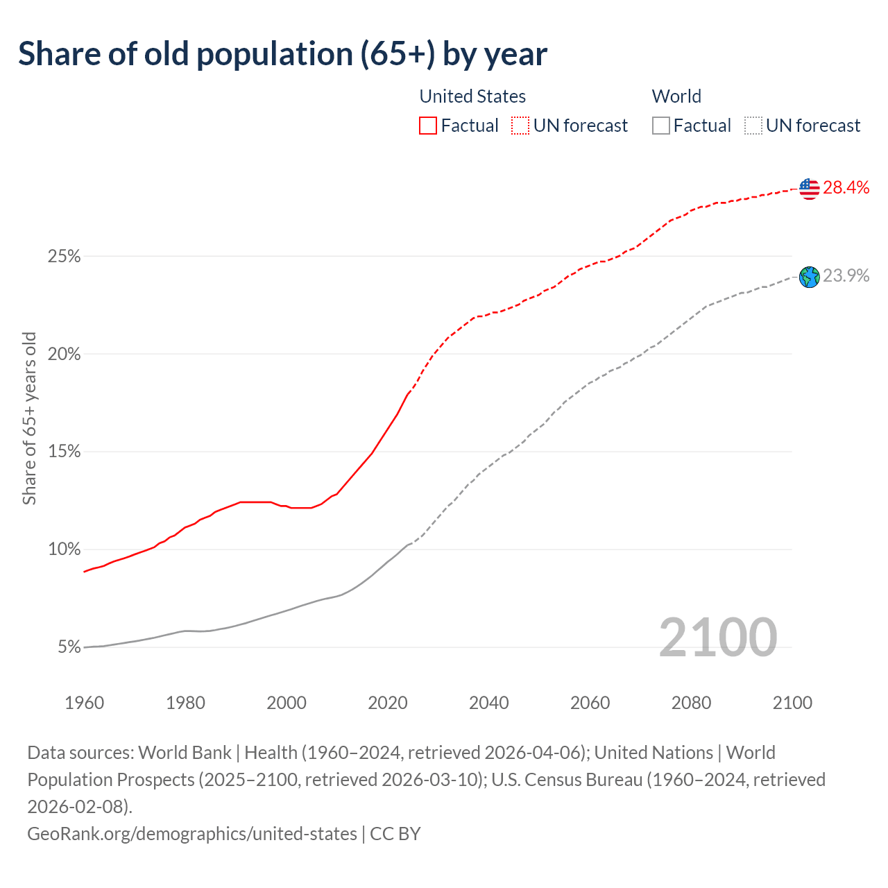 The share of older people aged 65 and over in the United States increased from 12.1% to 17.9% between 2004 and 2024.