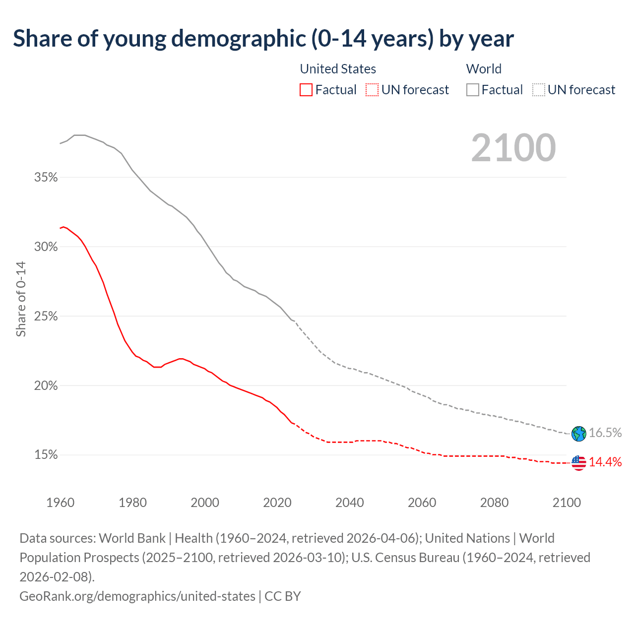 The share of children aged 0-14 in the United States decreased from 20.5% to 17.3% between 2004 and 2024 due to changes in birth rates.