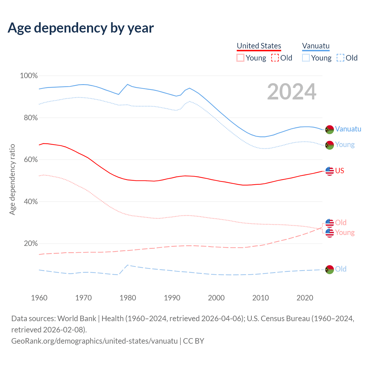 - The share of old-age demographic (65+) in the United States is 17.9% vs 4.3% in Vanuatu.