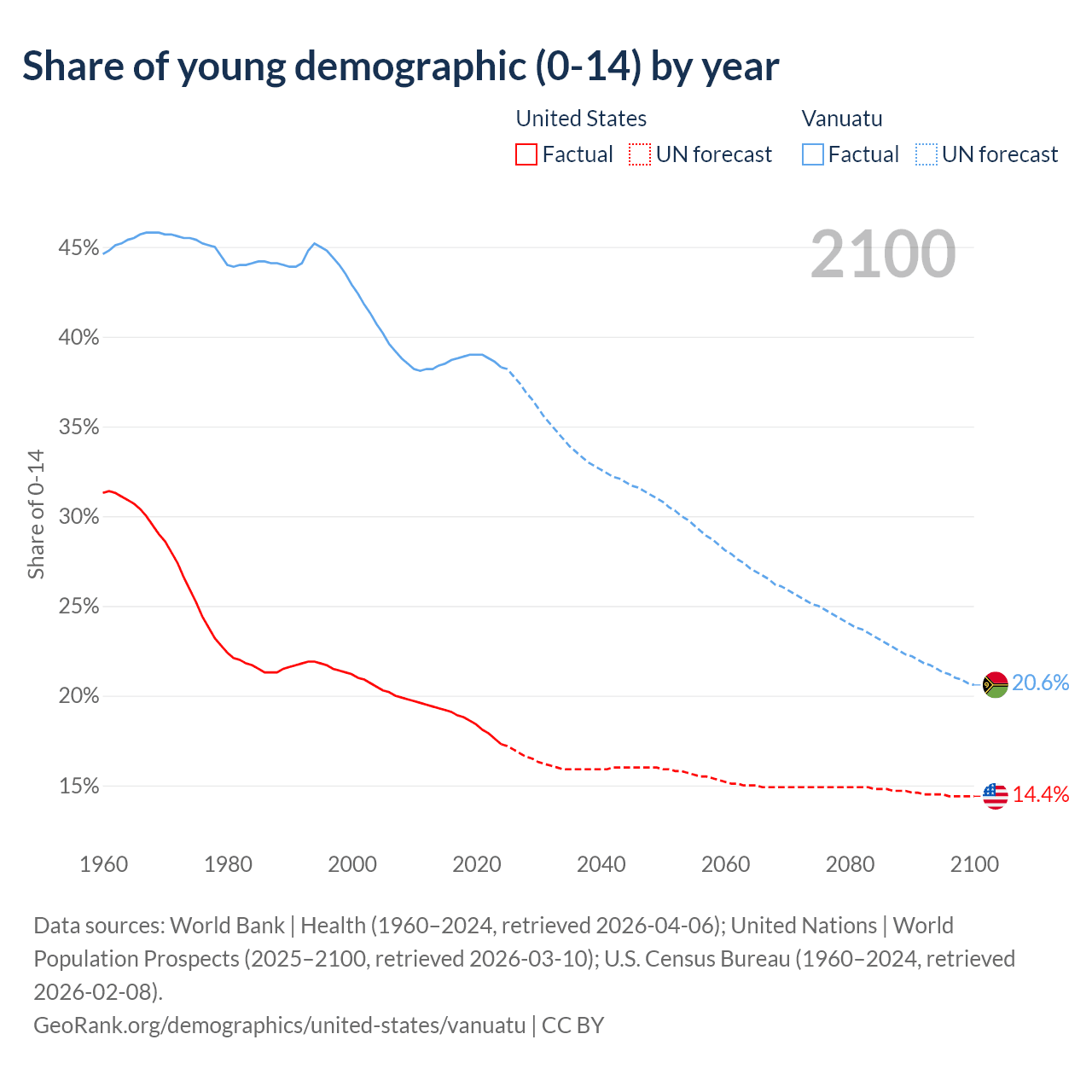 - The share of young demographic (0-15 years old) in the United States is 17.3% vs 38.3% in Vanuatu.
