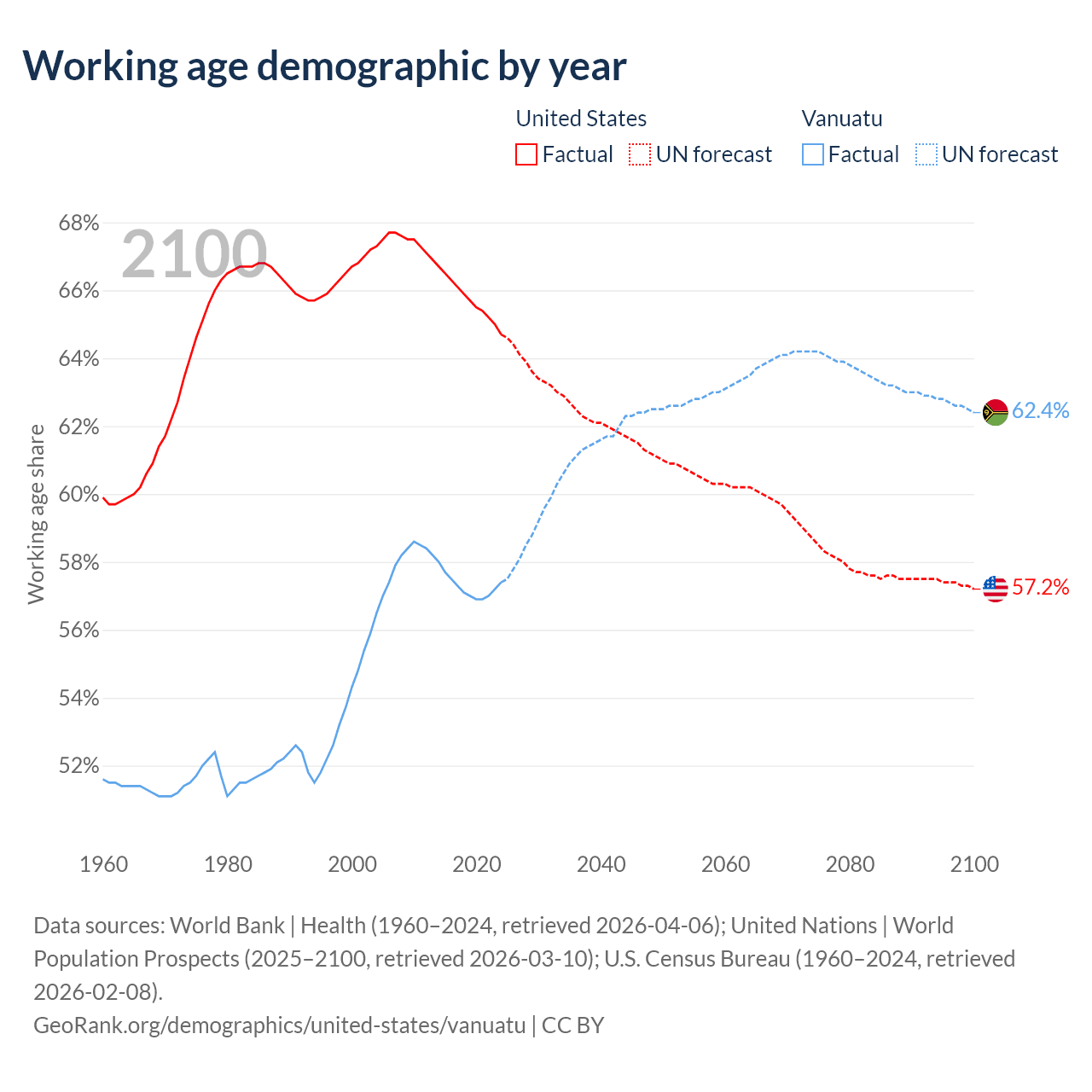 Median age United States vs Vanuatu, 1960-2100
