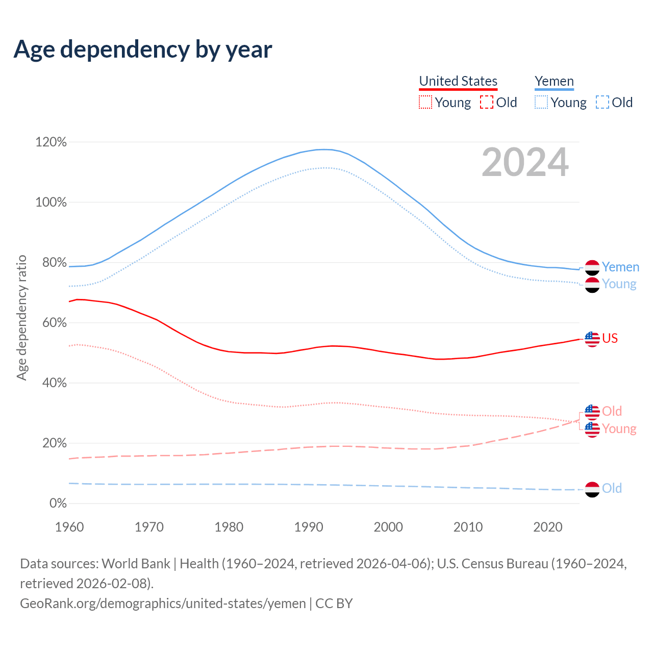 The share of older people aged 65 and over is 17.9% in the United States and 2.52% in Yemen. Life expectancy in the United States compared to Yemen .