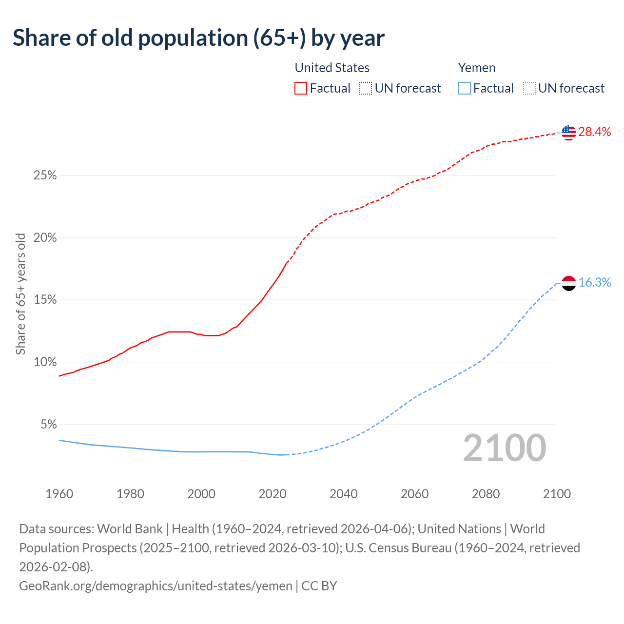 - The share of old-age demographic (65+) in the United States is 17.9% vs 2.52% in Yemen.