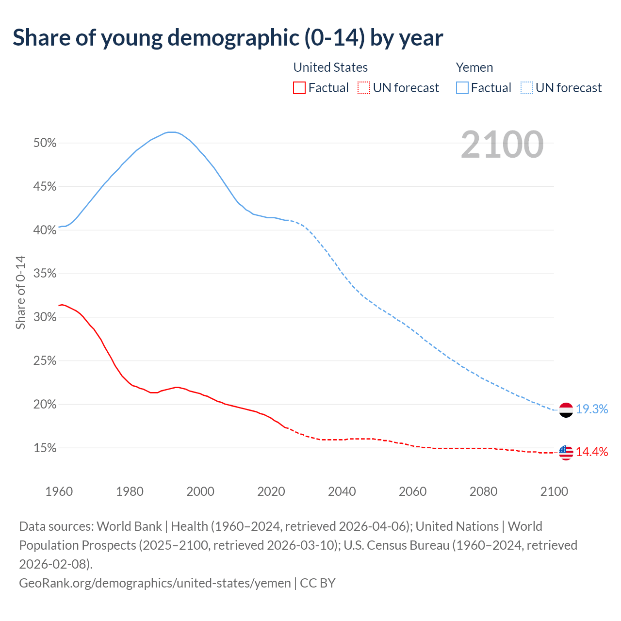 - The share of young demographic (0-15 years old) in the United States is 17.3% vs 41.1% in Yemen.