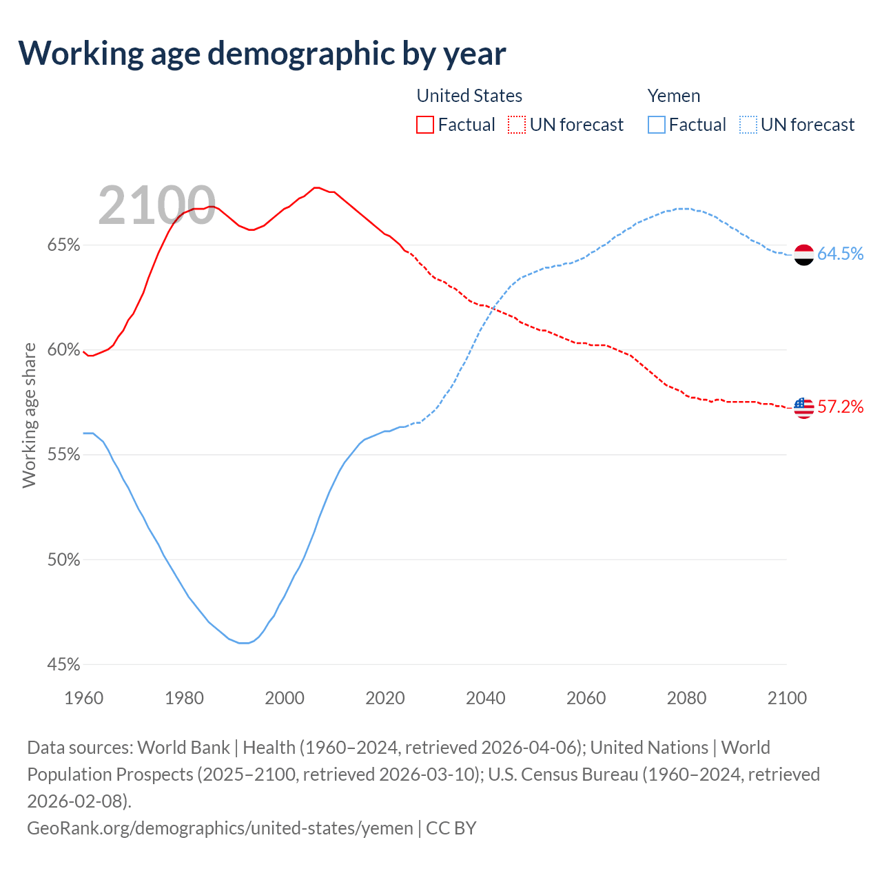 - The United States has 223M working age adults (aged 15-64) vs 24.4M in Yemen.