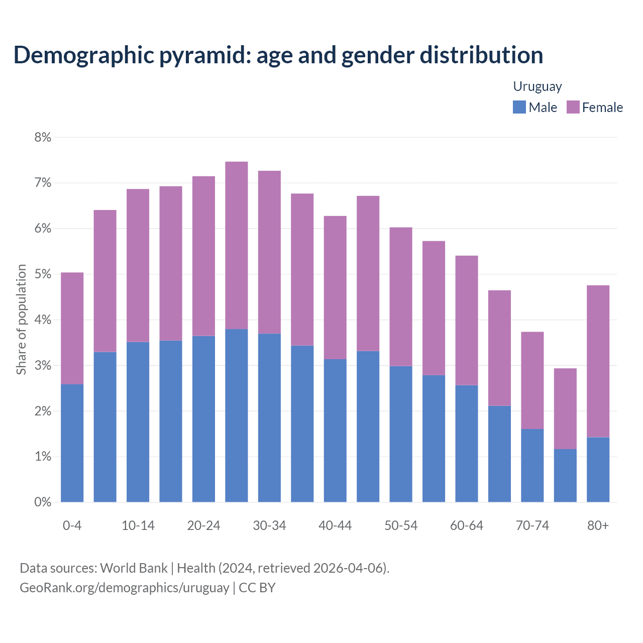 With a population of 3.39M people, Uruguay has a median age of 37.2 years which makes it the 63/196 oldest country. 18.3% of the demographic are children 0-14 years old, 65.7% are working-age people aged 15-64, and 16% are older population aged 65+ years.