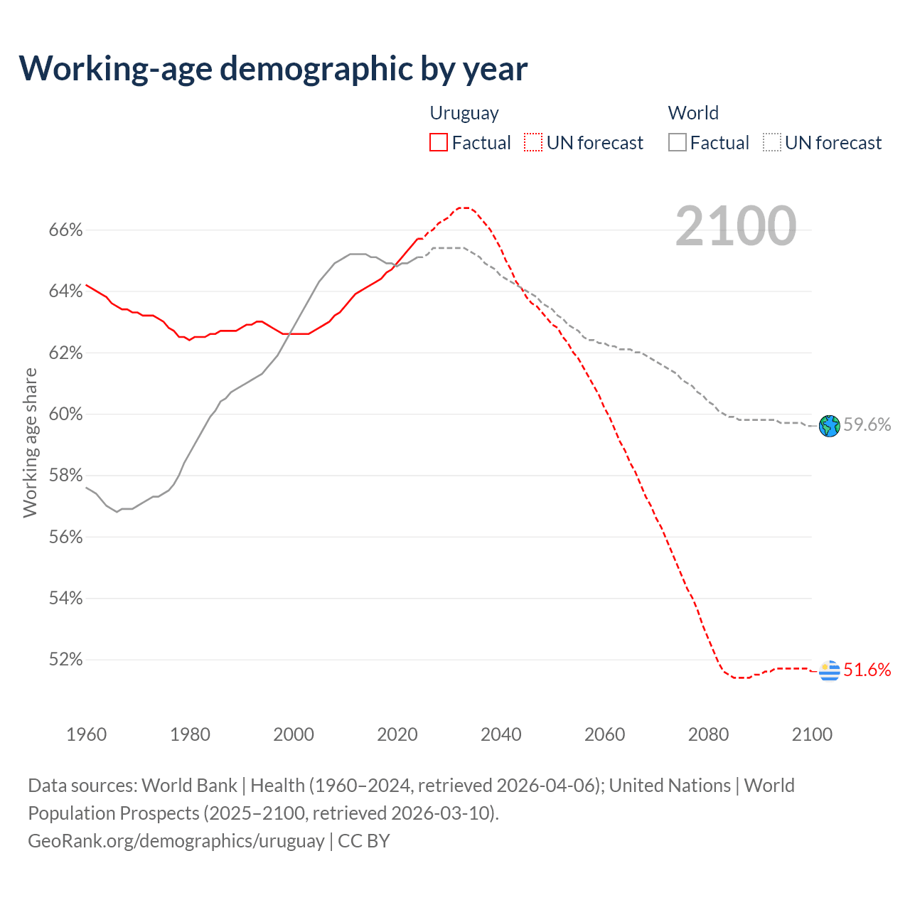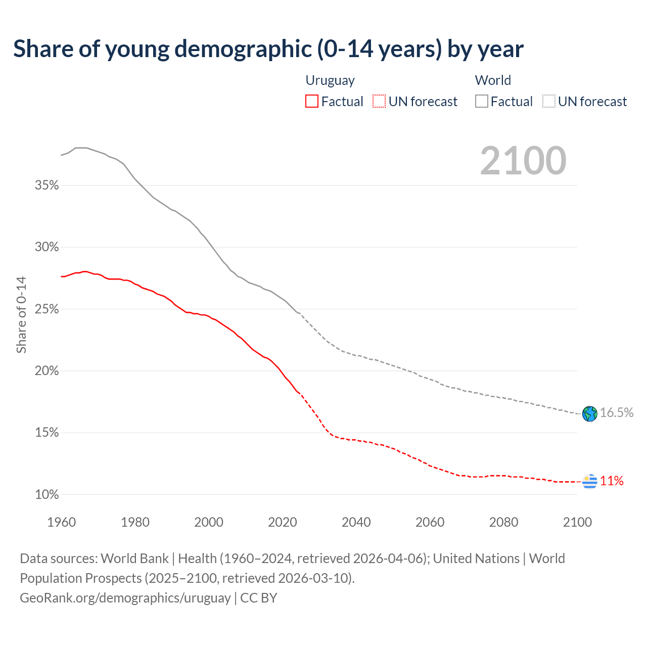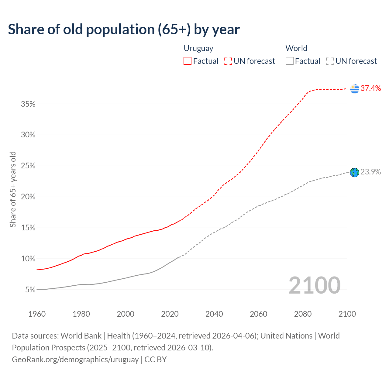 Median age in Uruguay, 1960–2100