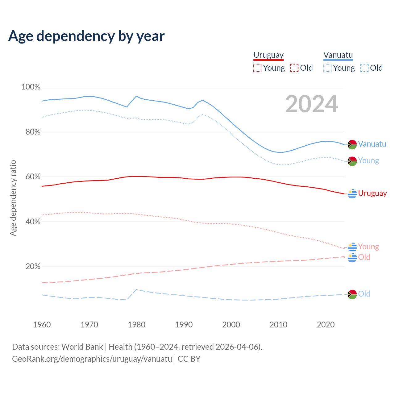 - The share of old-age demographic (65+) in Uruguay is 16% vs 4.3% in Vanuatu.