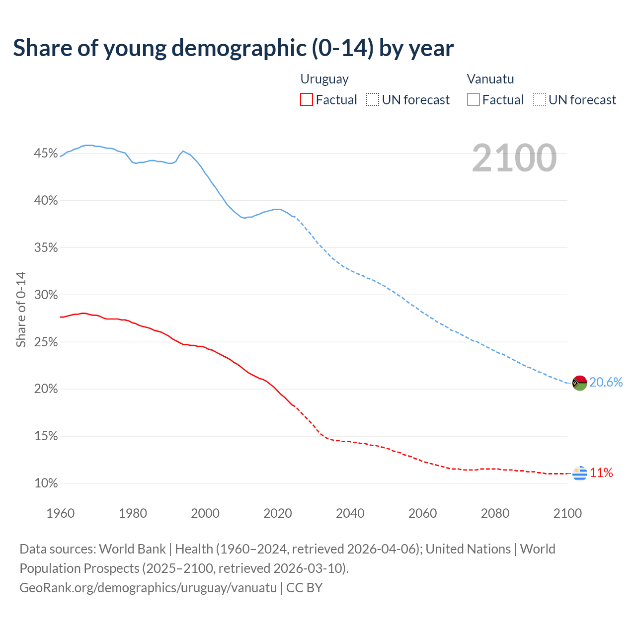 - The share of young demographic (0-15 years old) in Uruguay is 18.3% vs 38.3% in Vanuatu.