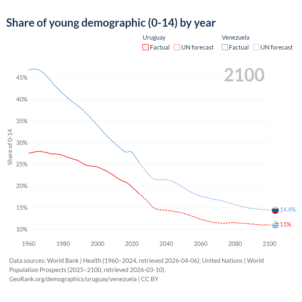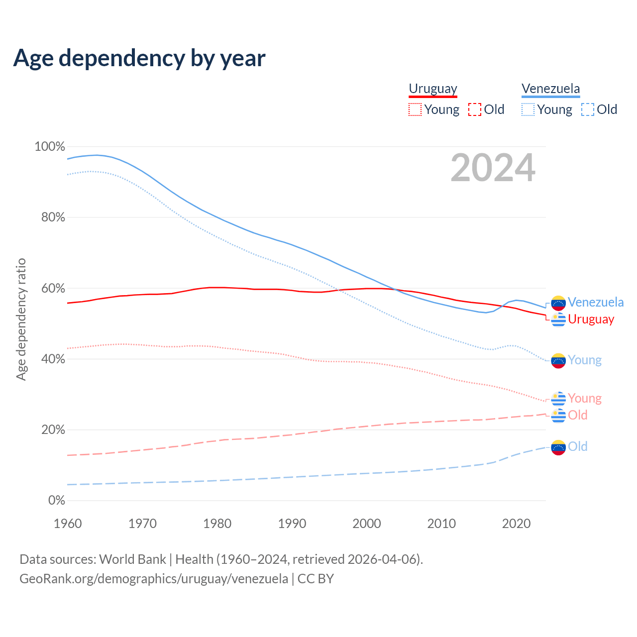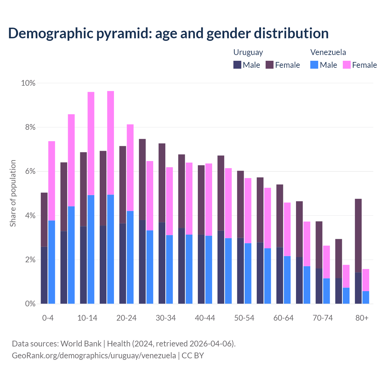 - Uruguay is ranked 63/196 by median age (oldest to youngest) vs 104/196 for Venezuela.