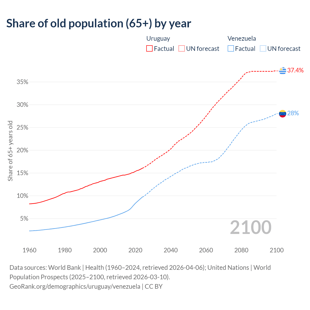 The share of older people aged 65 and over is 16% in Uruguay and 9.68% in Venezuela. Life expectancy in Uruguay compared to Venezuela .