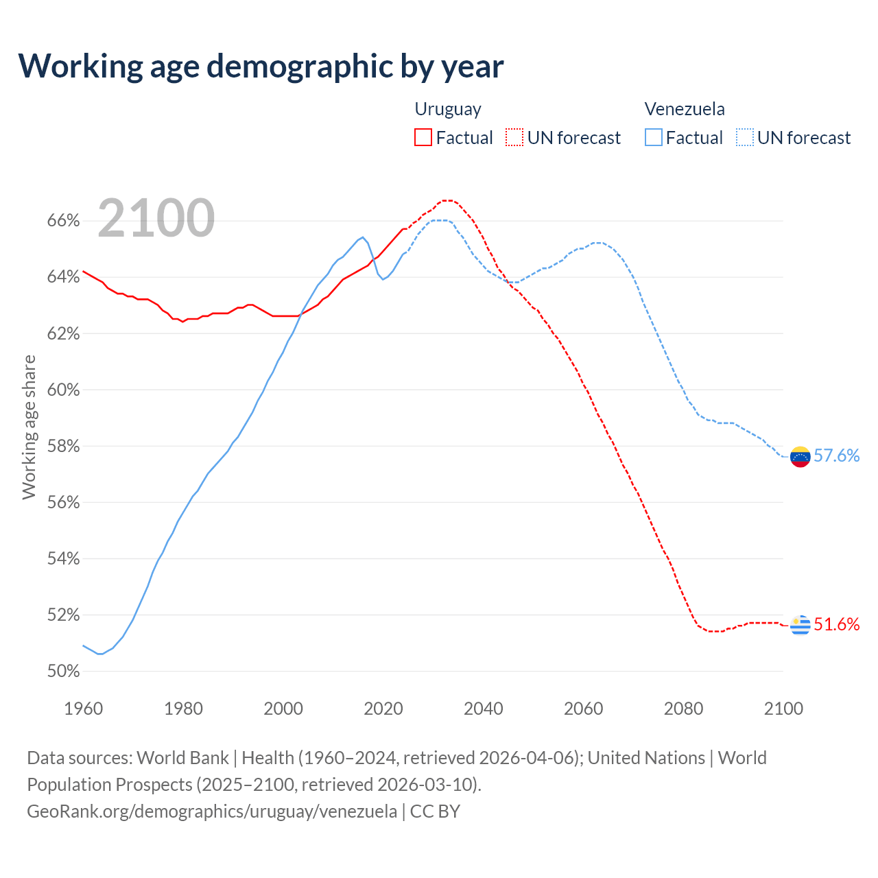 - Uruguay has 2.22M working age adults (aged 15-64) vs 18.6M in Venezuela.